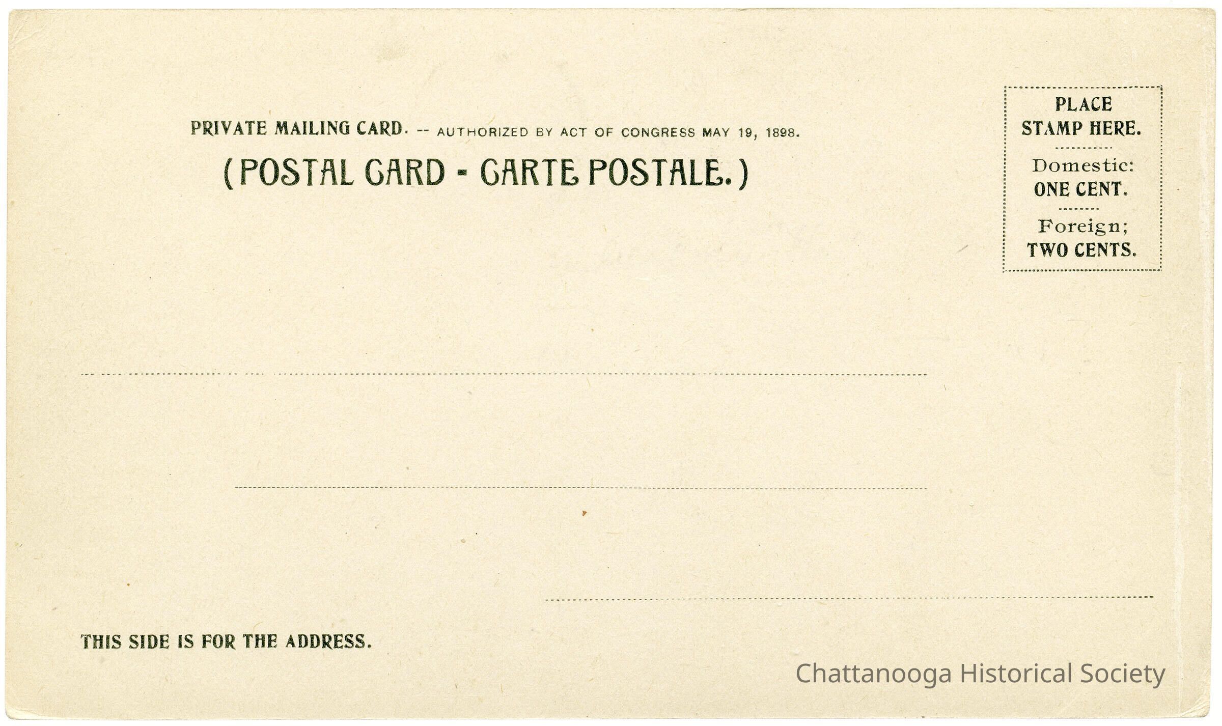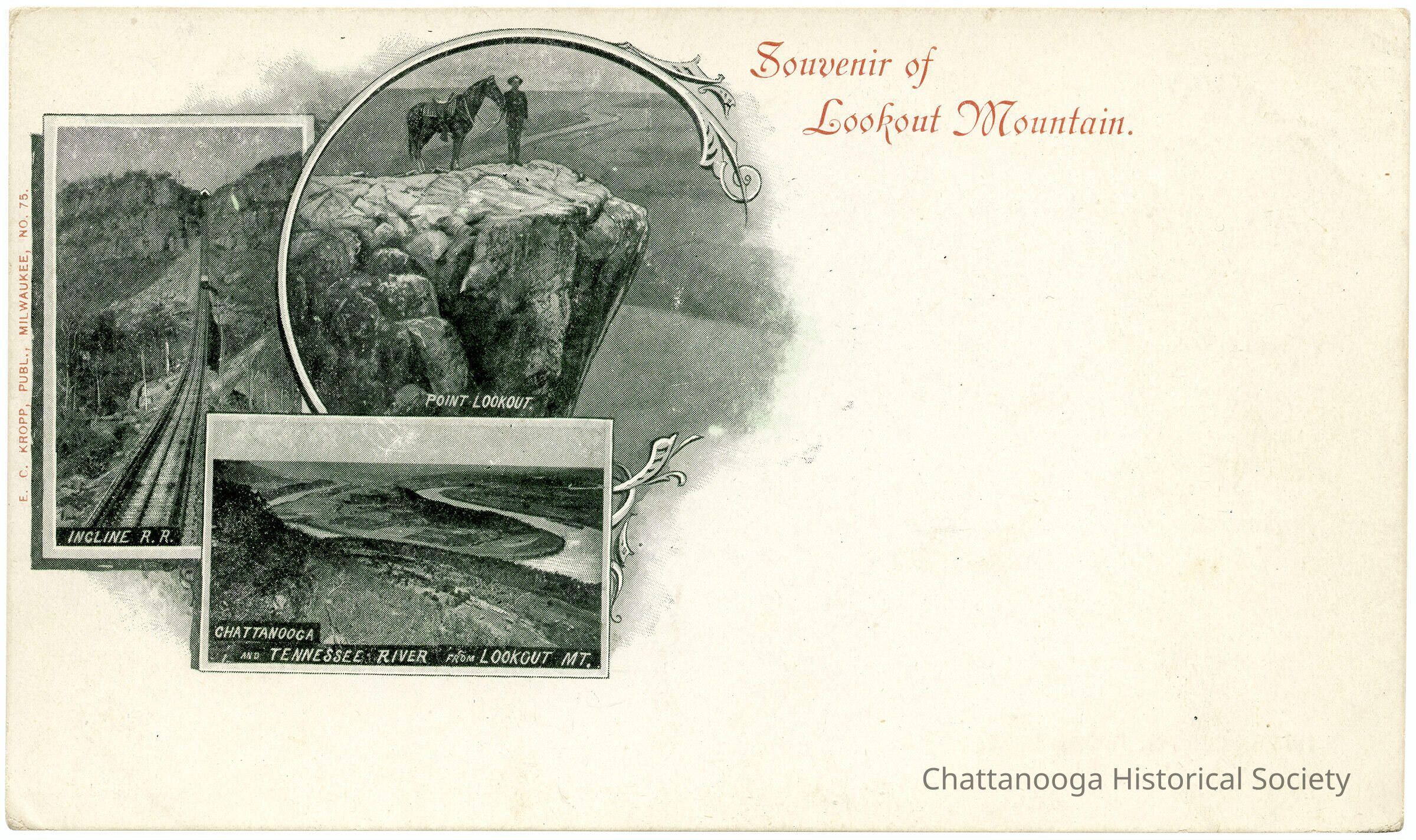 A vignette private mailing card with the front showing an illustration of three scenes from Lookout Mountain, Tennessee. The scene showing the incline rail road on its trip up the mountain, a drawing of Point Lookout with a man posed with a dark horse, and an illustration of the view of Chattanooga and the Tennessee River from Lookout Mountain. The top reads "Souvenir of Lookout Mountain" in red and there is a large blank space to the right for correspondence.