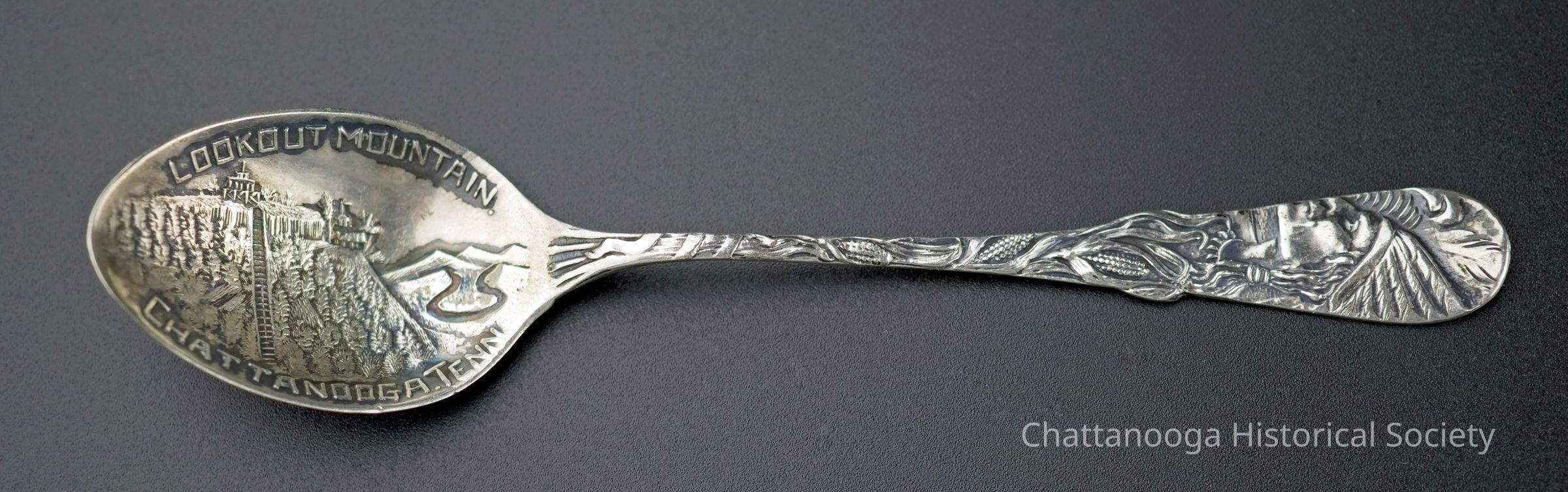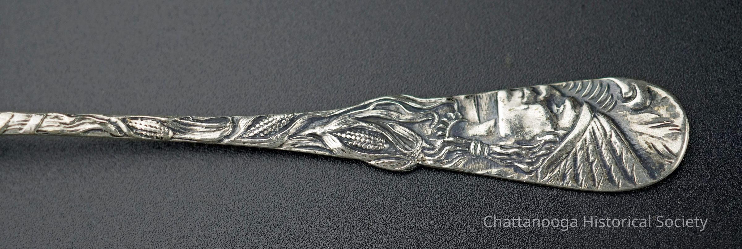 Sterling silver souvenir spoon for Lookout Mountain, Tennessee. The relief detail on the spoon shows Incline Number 2 with the station at the top of the mountain as well as the Point Hotel with Moccasin Bend in the background. The relief on the handle is made of ears of corn and a stereotypical portrait of a Native Americana chief.Collection