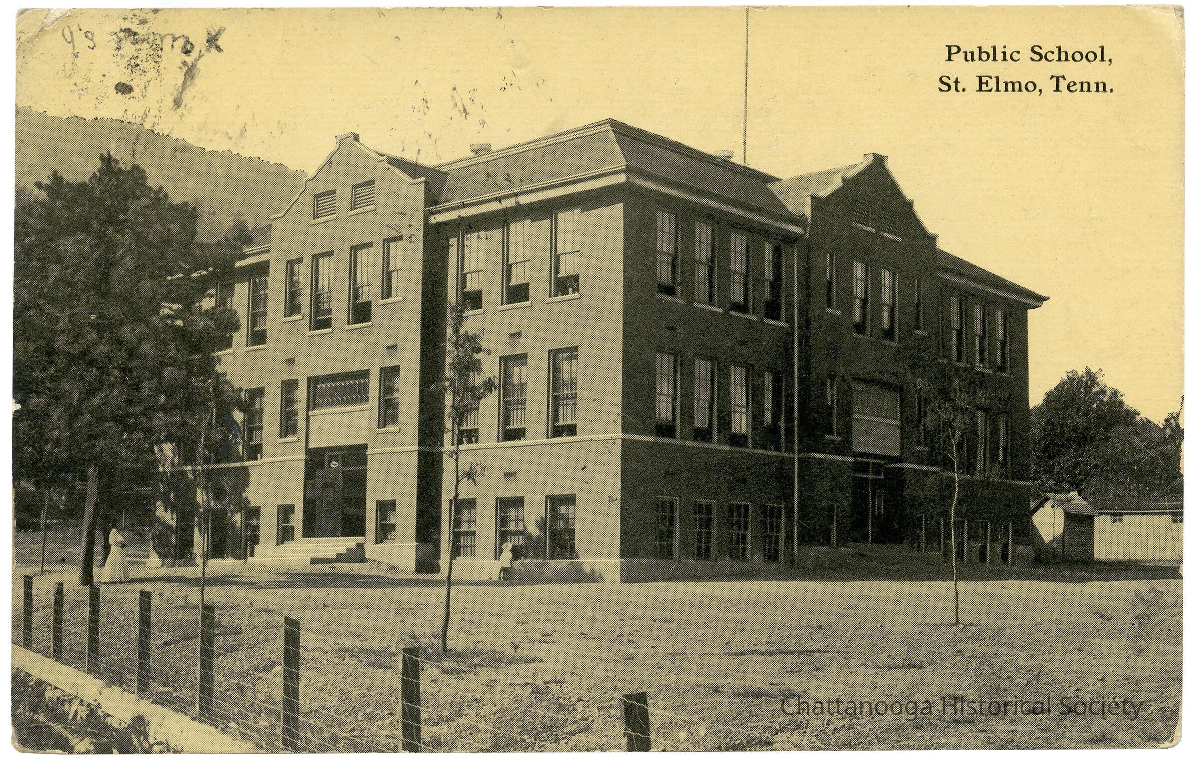 A postcard with the front showing the Public School, St. Elmo, Tennessee. The school is at 4625 St. Elmo AveSubject