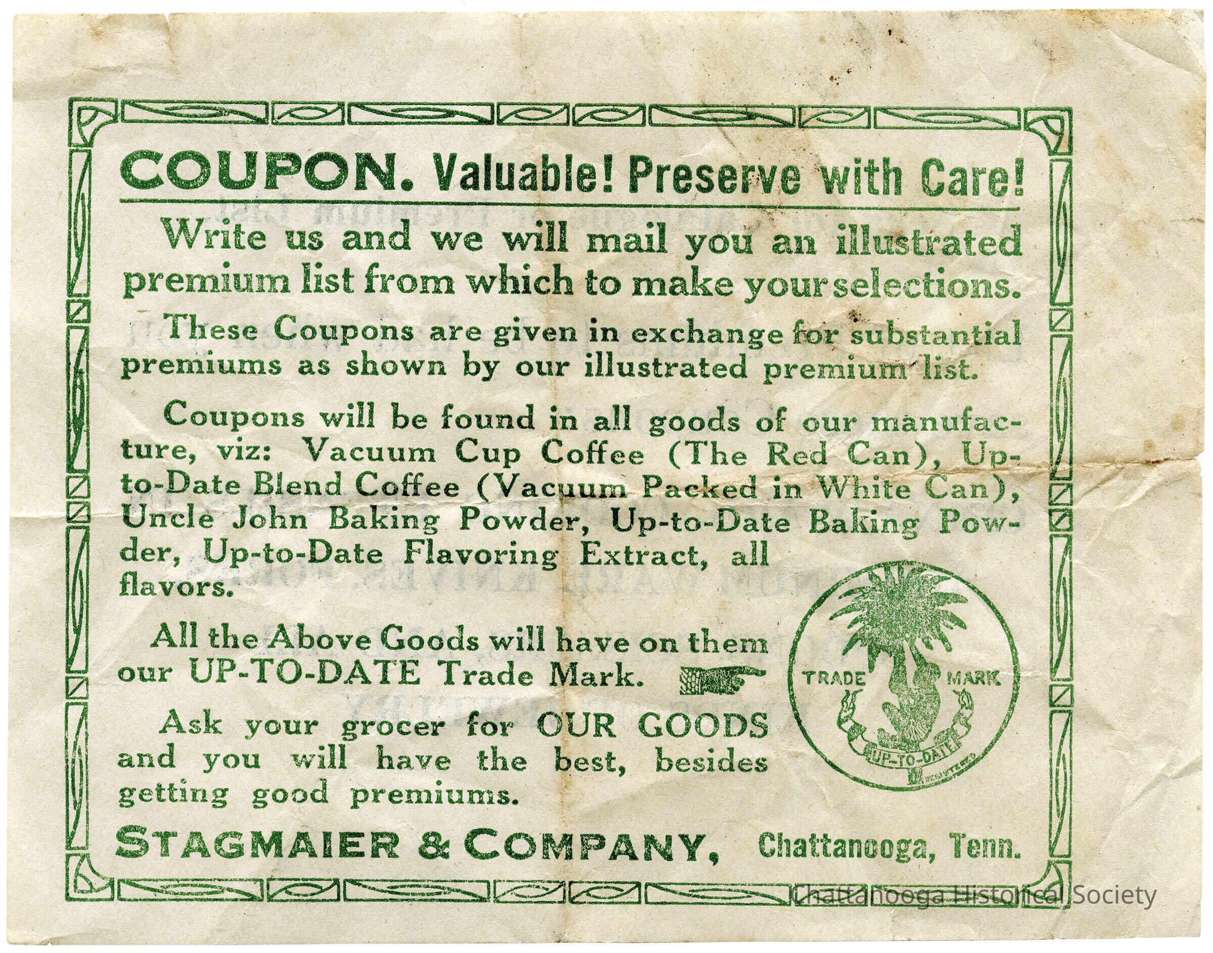 Coupons will be found in all goods of our manufacture, viz: Vacuum Cup Coffee (The Red Can), Up-to-Date Blend Coffee (Vacuum Packed in White Can), Uncle John Baking Powder, Up-to-Date Baking Powder, Up-to-Date Flavoring Extract, all flavors.