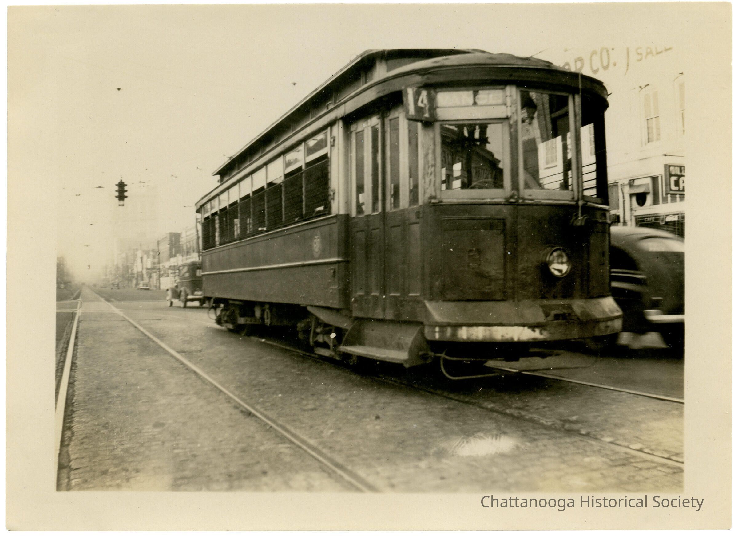 A photograph of a streetcar traveling on the Vance Route down Market Street.Photograph Details