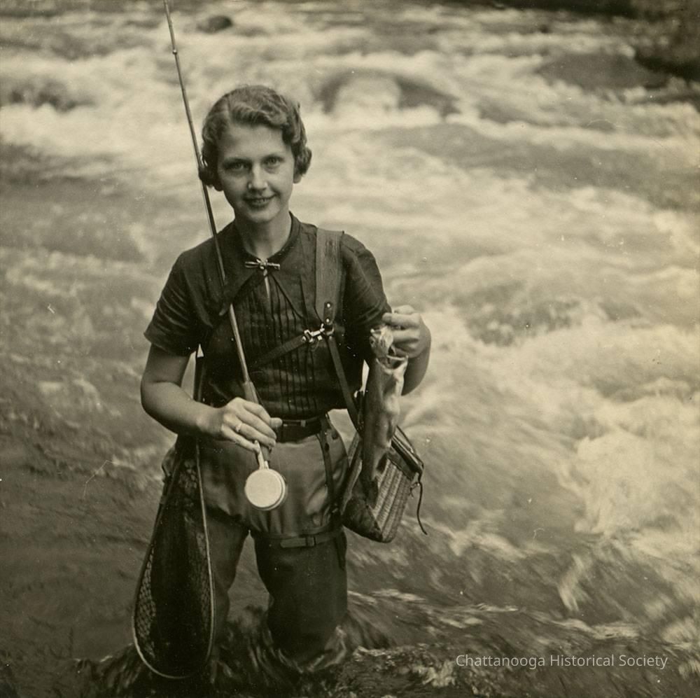 Black and white photograph of a young woman showing her catch to the photographer. The woman is wearing a pleated, short sleeved shirt with mandarin collar. The shirt is ticked into a pair of brown pants that are tucked into hip-high boots. A leather harness is holding a wicker creel close to her hip. The woman is holding a trout in her left hand while her right supports her fishing pole. The woman is standing in running water of what may be Bald River Falls in Tellico Plains, Monroe County, Tennessee c. 1950.Photograph Details
