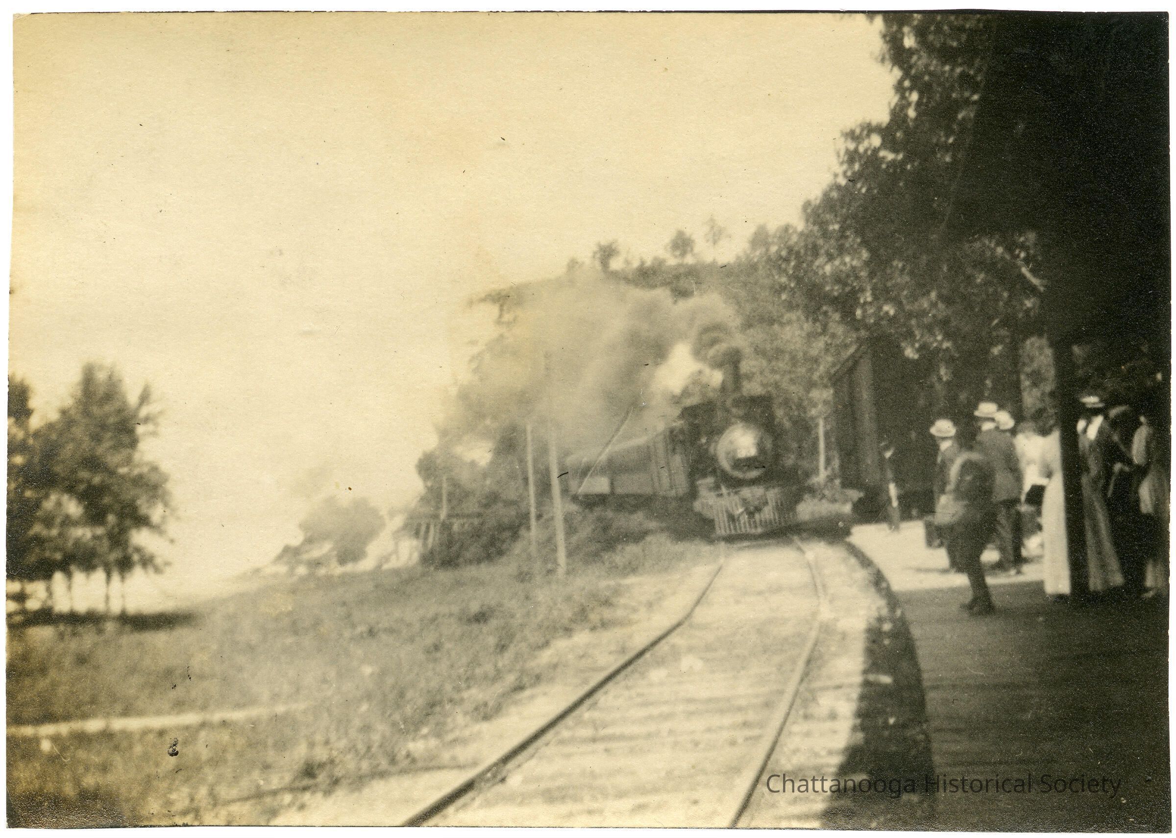 A black and white photograph of a train pulling up to Sunset Station on Lookout Mountain, Tennessee, near Sunset Rock. The photograph shows multiple travelers standing on a wooden platform, watching the train approach.