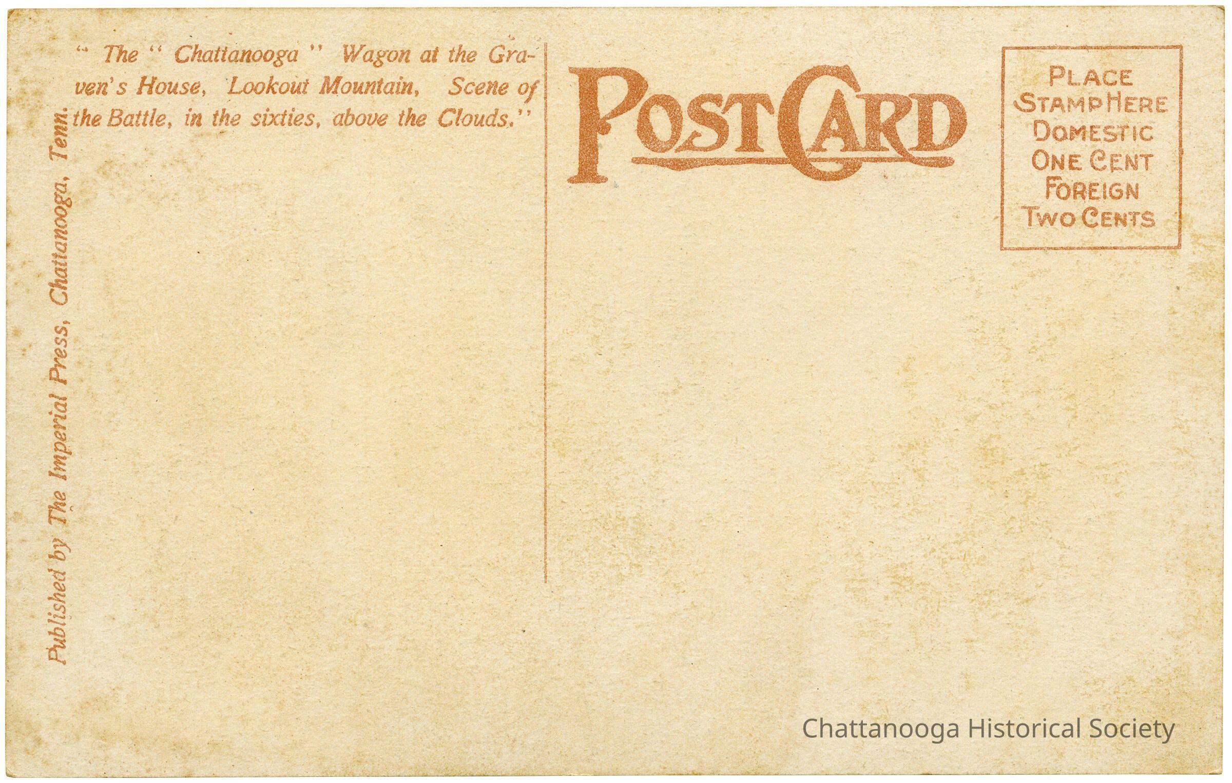 The rear reads "The 'Chattanooga' Wagon at the Craven's House, Lookout Mountain, Scene of the Battle, in the sixties, above the Clouds."Subject Person/Organization