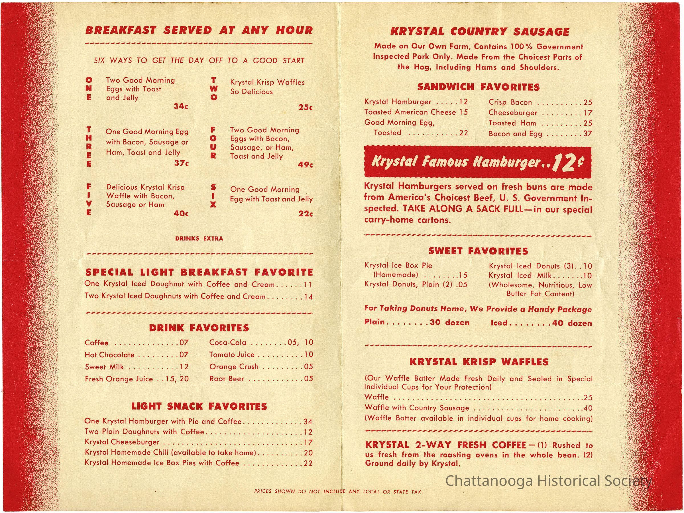 A paper, bifold menu from The Krystal chain of restaurants. The menu is red with white fonts and pink accent. The front cover features an image of a typical Krystal restaurant with "Food Favorites" written underneath. The menu items inside include the breakfast menu and other specials like 12 cents Krystal Burgers and coffee for 7 cents.Collection