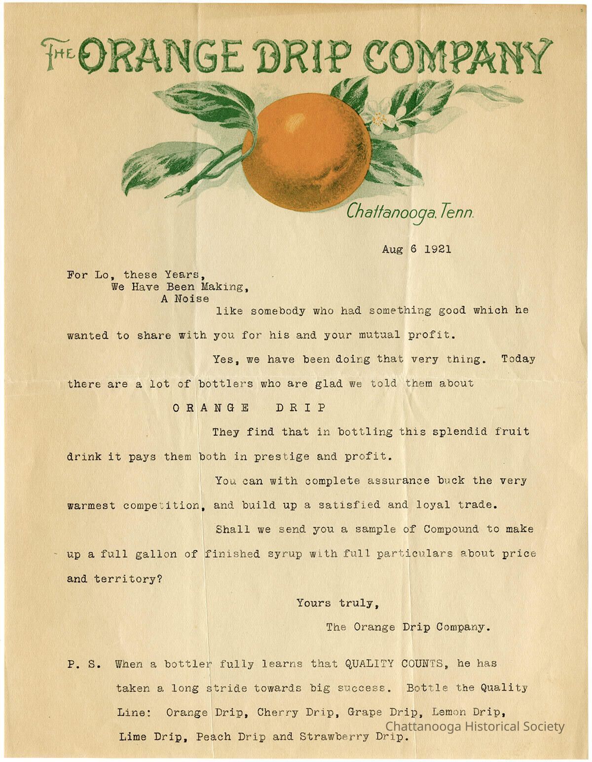 Correspondence from The Orange Drip Company promoting their Orange Drip syrup.