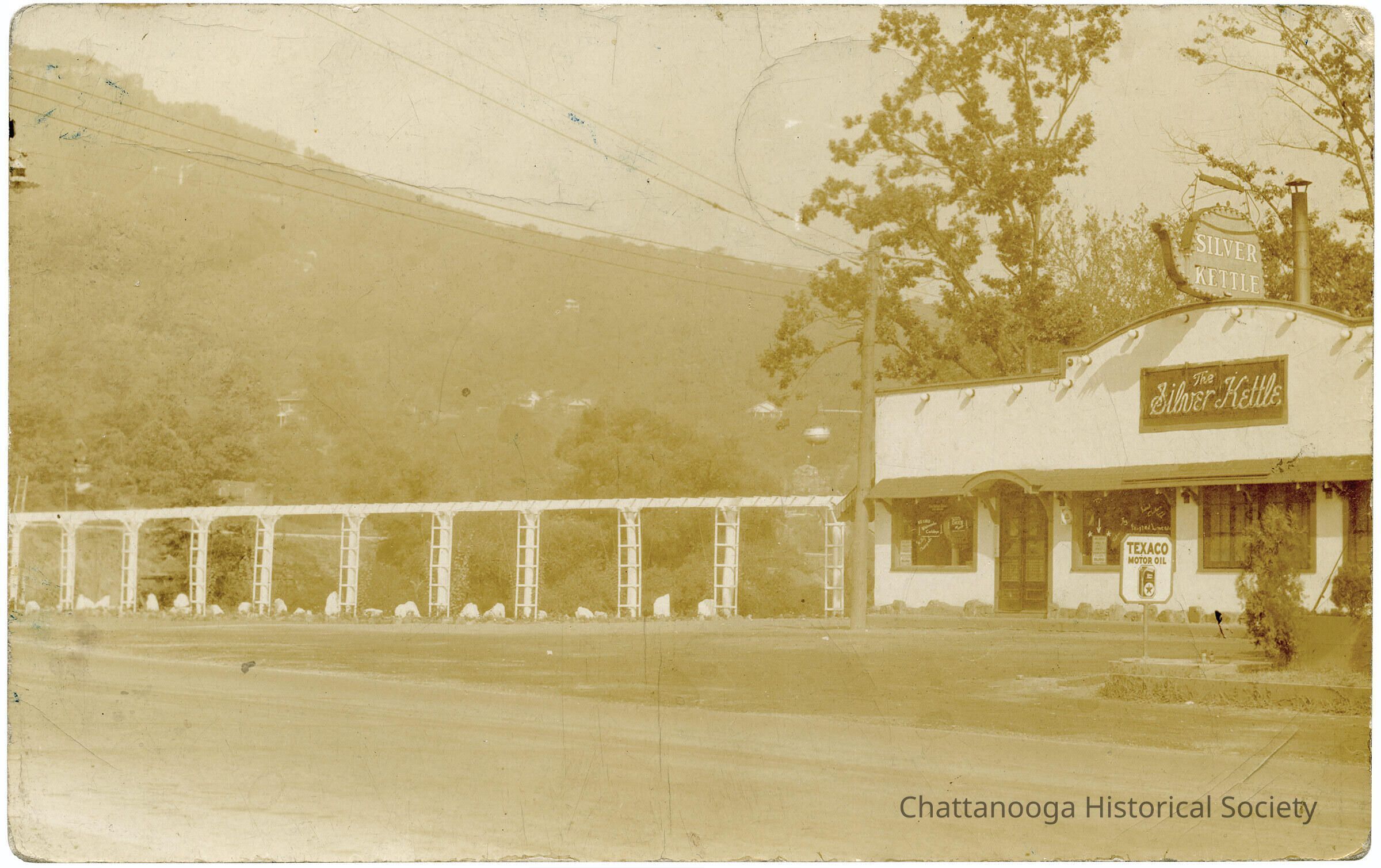 A postcard with the front showing a photograph of The Silver Kettle, a restaurant on Broad Street in Chattanooga, Tennessee. There is a kettle shaped sign at the top of the building as well as a sign advertising Texaco Motor OilSubject Person/Organization