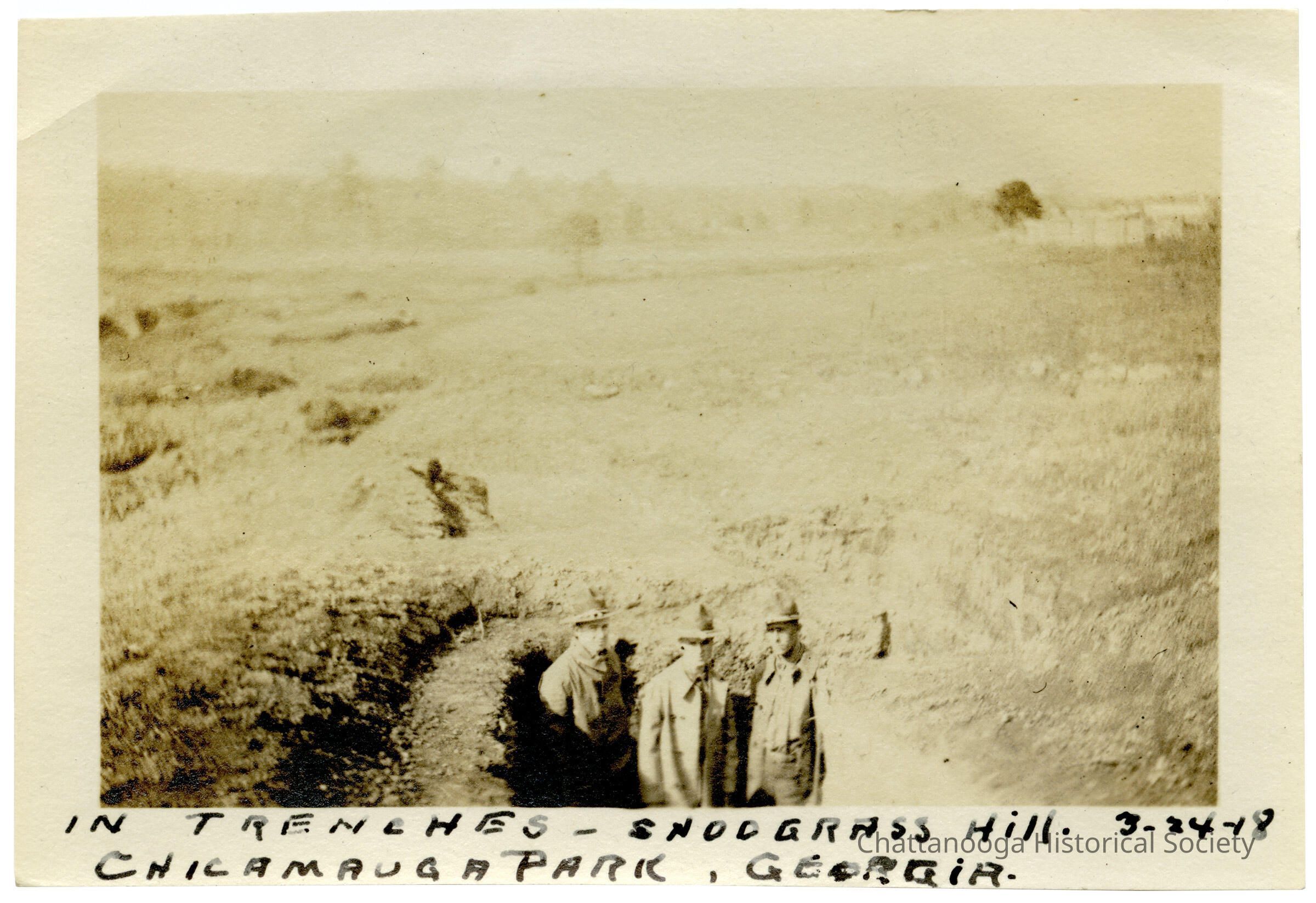 A photograph of soldiers training for trench warfare during World War I at the Chickamauga Park, dated 24 March 1918