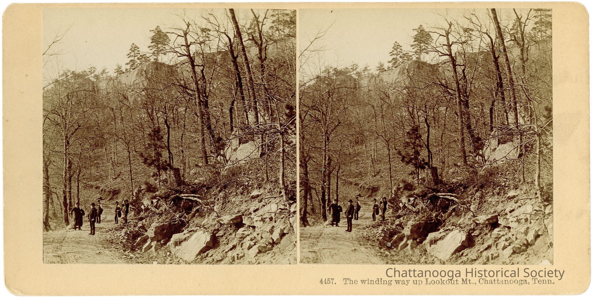 A stereographic view of a winding unpaved road up Lookout Mountain, Tennessee. The double image shows a group of five men in dark suits walking up a dirt road on Lookout Mountain. The road wraps around a wooded, rocky hill. The stereograph card is labeled "4457. The winding way up Lookout Mt., Chattanooga, Tenn."