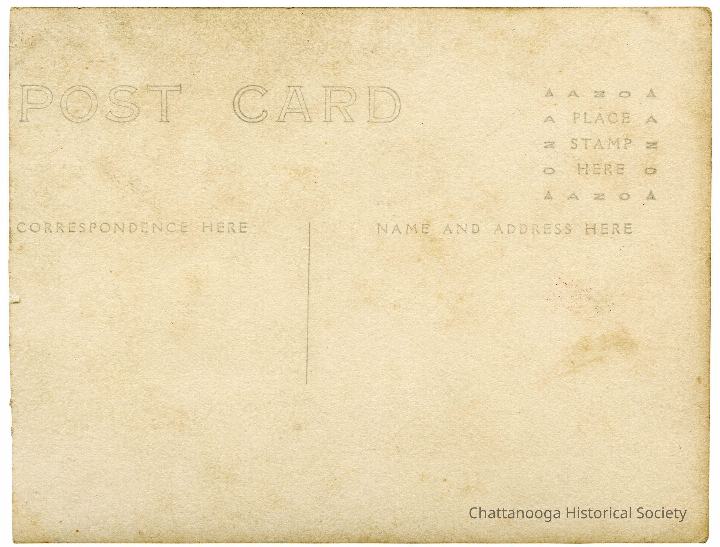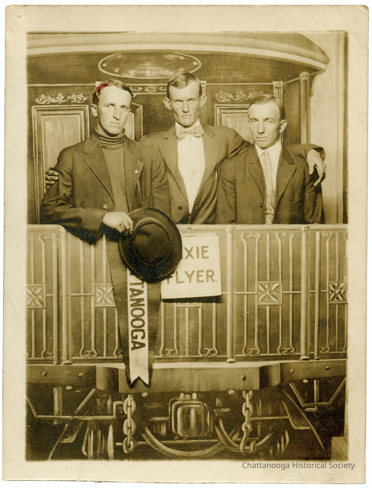 A gelatin-silver printed postcard with the front showing a portrait of three men standing in front of a replica of the passenger train, Dixie Flyer. A banner with Chattanooga is hanging vertical from its painted railing.Subject Person/Organization