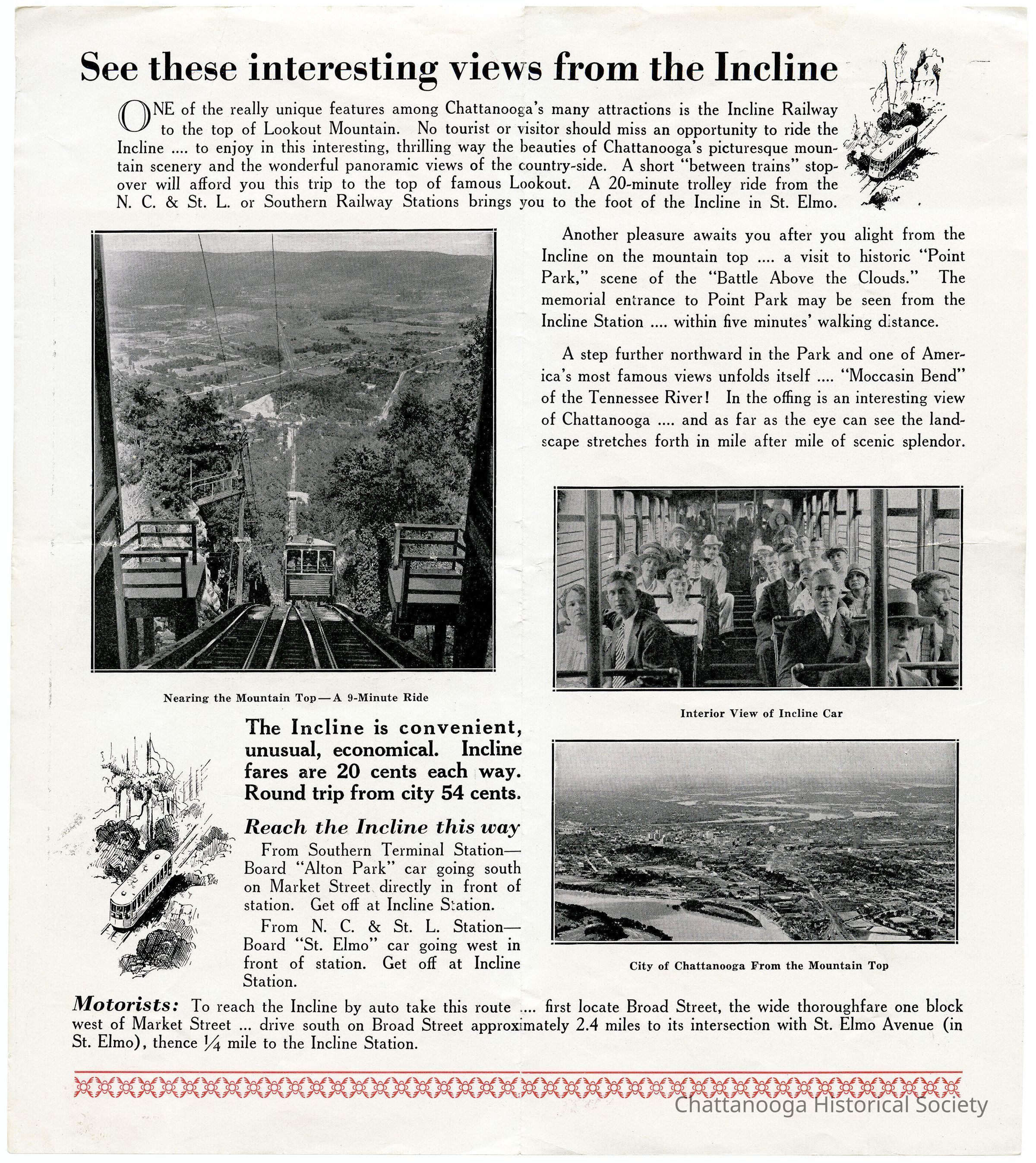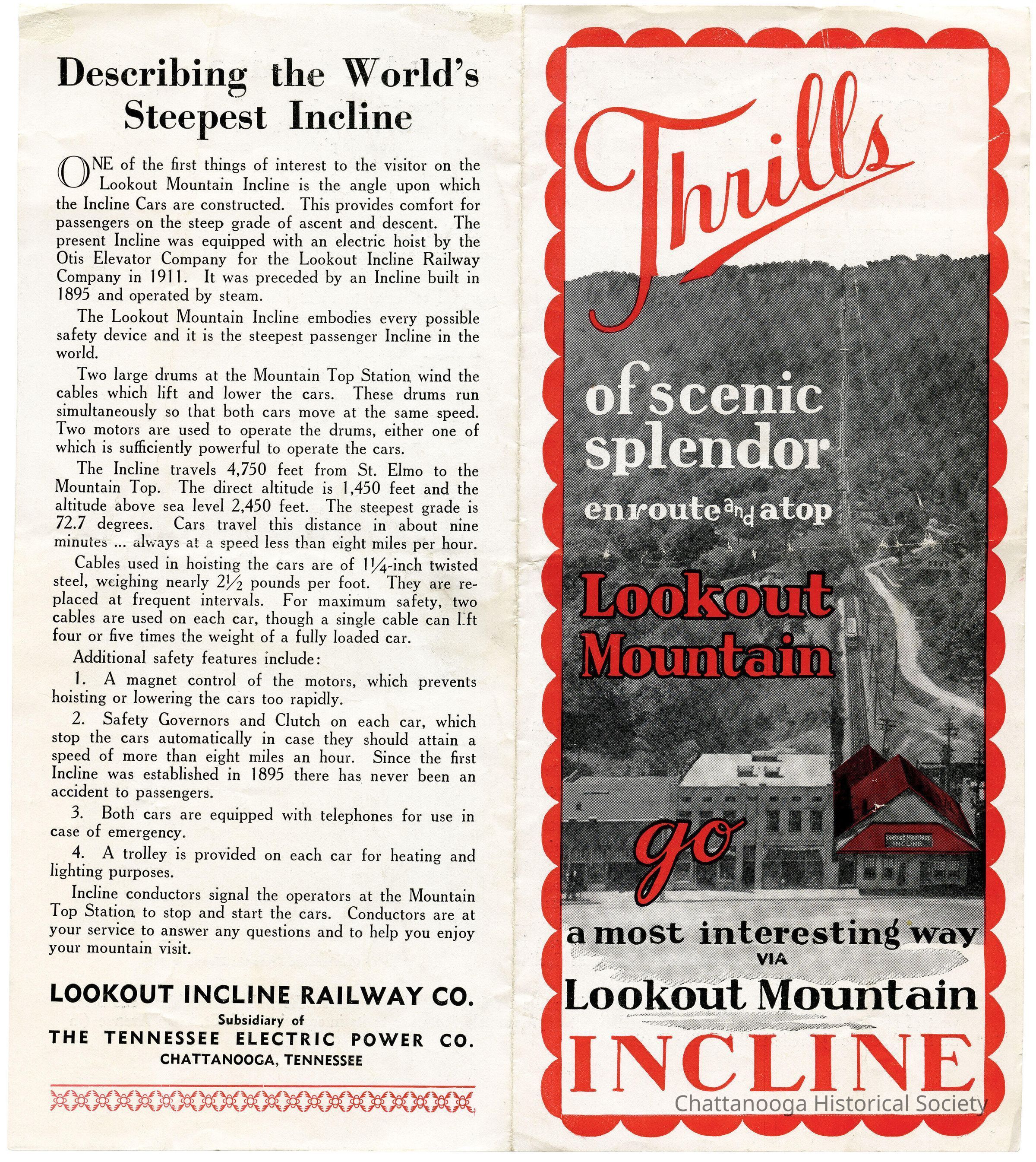 Souvenir brochure describing the "thrills of scenic splendor enroute and atop Lookout Mountain, Go, a most interesting way via Lookout Mountain Incline". The brochure features a black and white image of the bottom of the incline in St. Elmo with red colorization of the Incline's station and is bordered in red half-circles. The brochure features a description of the "World's Steepest Incline" which includes information on safety features as well as a description of the views from the incline and the top of Lookout.Collection