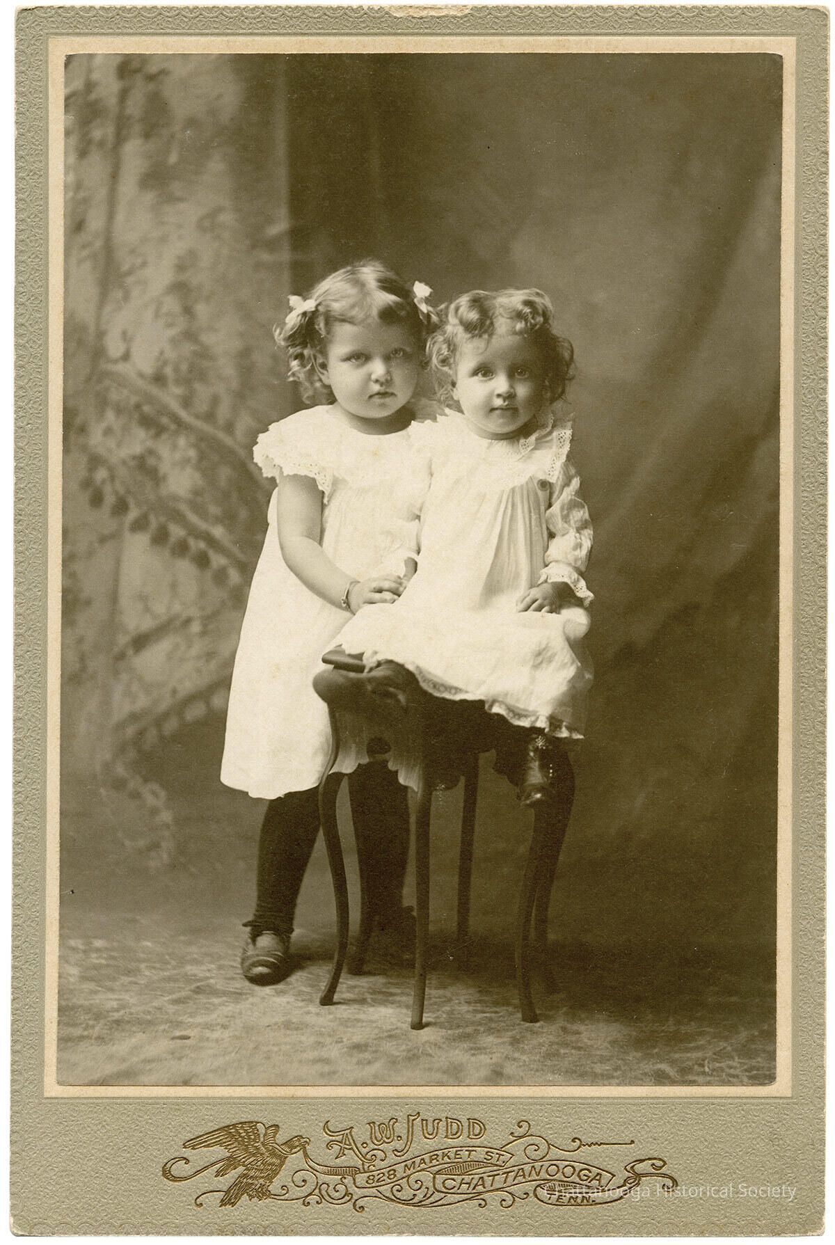 A photograph mounted on a cabinet card showing two young girls, one sitting on a small side table, by A. W. Judd.Photograph Details