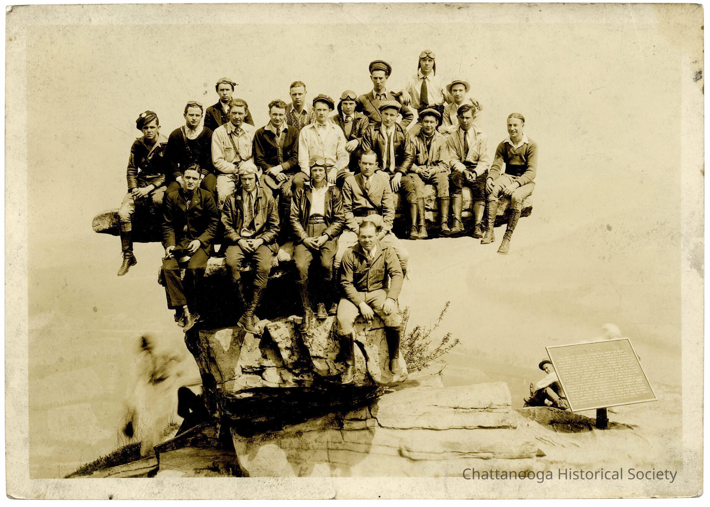 A photograph of twenty sitting men (possibly pilots) on Umbrella Rock atop Lookout Mountain, Tennessee. The verso is dated 1931