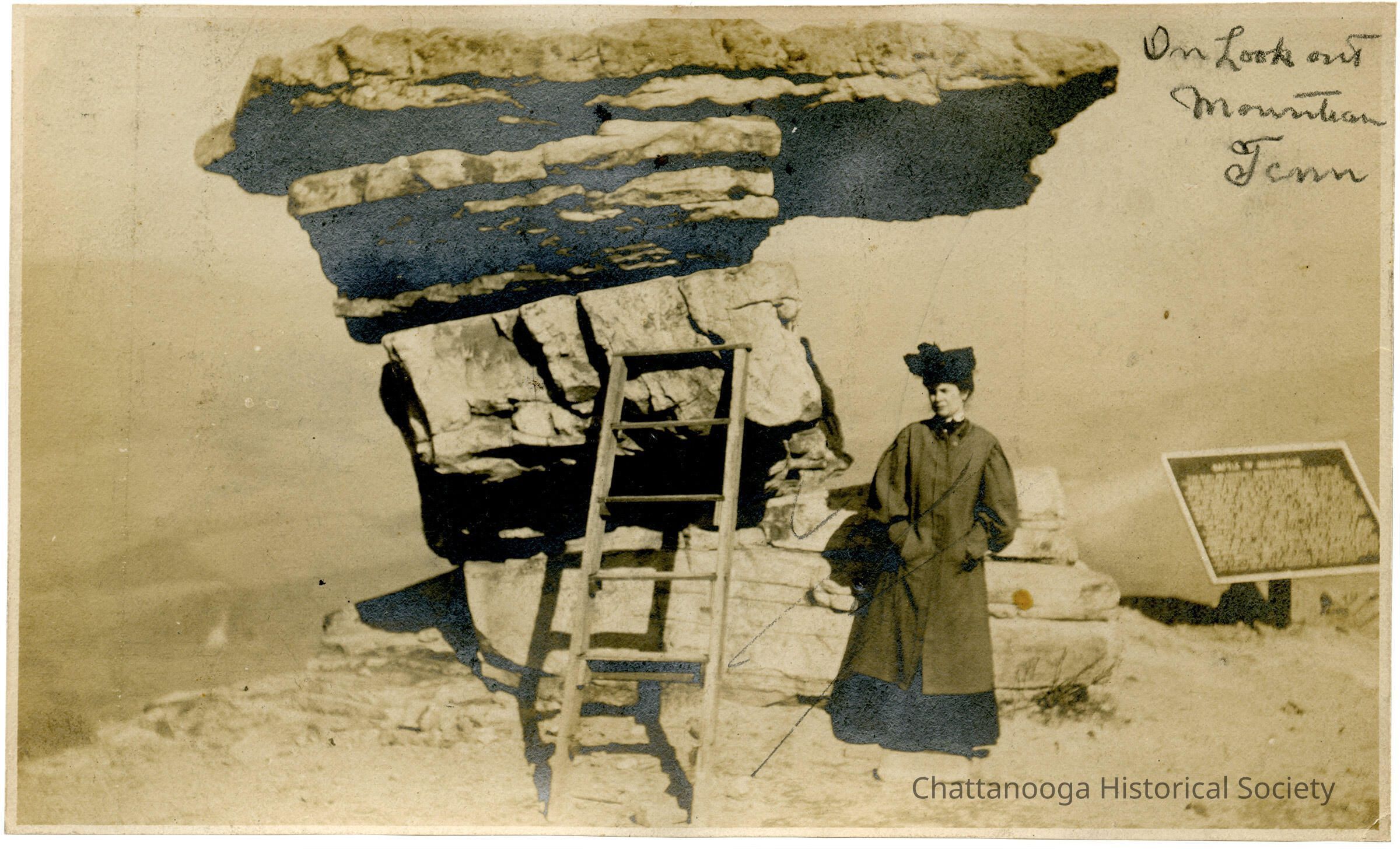 A photograph of woman posing by Umbrella Rock atop Lookout Mountain, Tennessee.