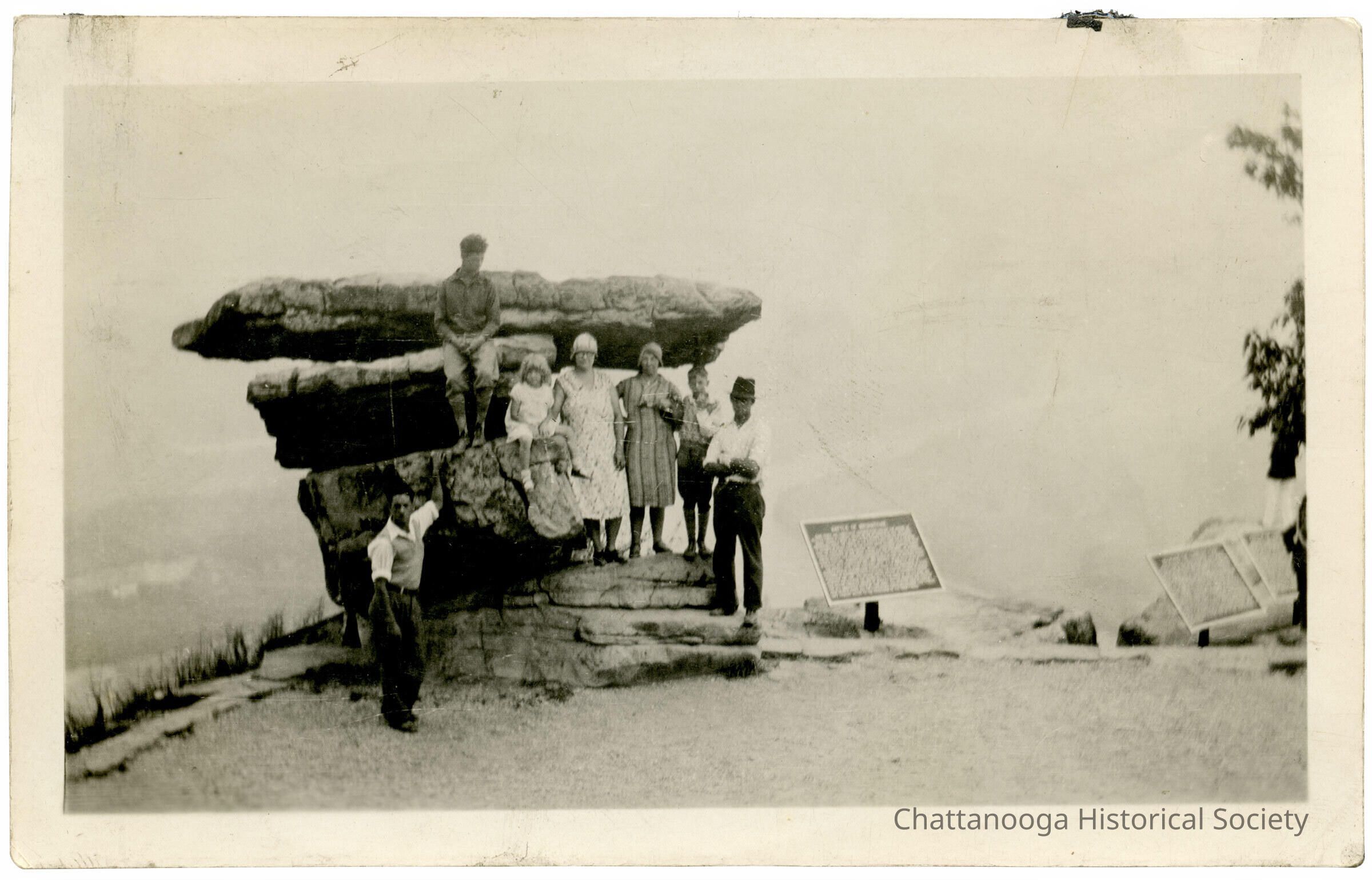 A photograph showing seven people posing on or by Umbrella Rock atop Lookout Mountain, Tennessee.