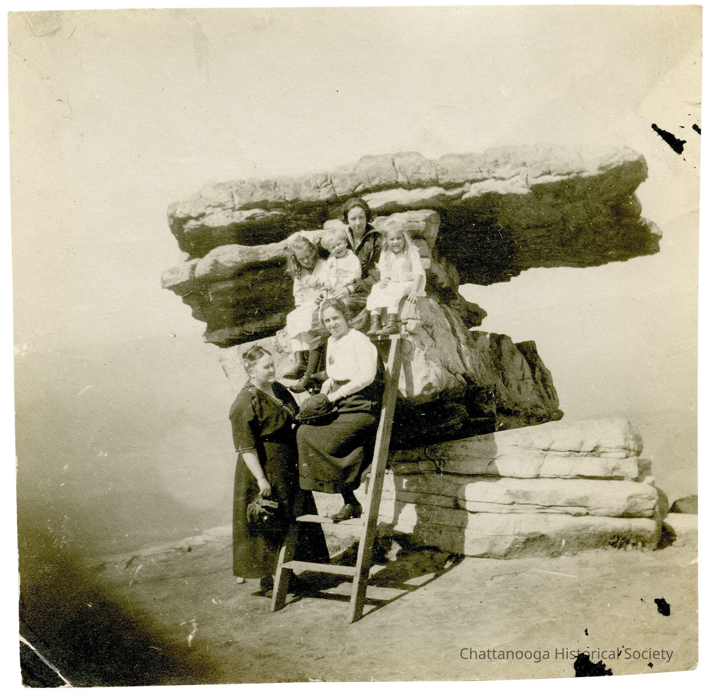 Group of ladies and children sitting on Umbrella Rock. One woman, at center, is sitting on a ladder with a hat on her lap.Photograph Details