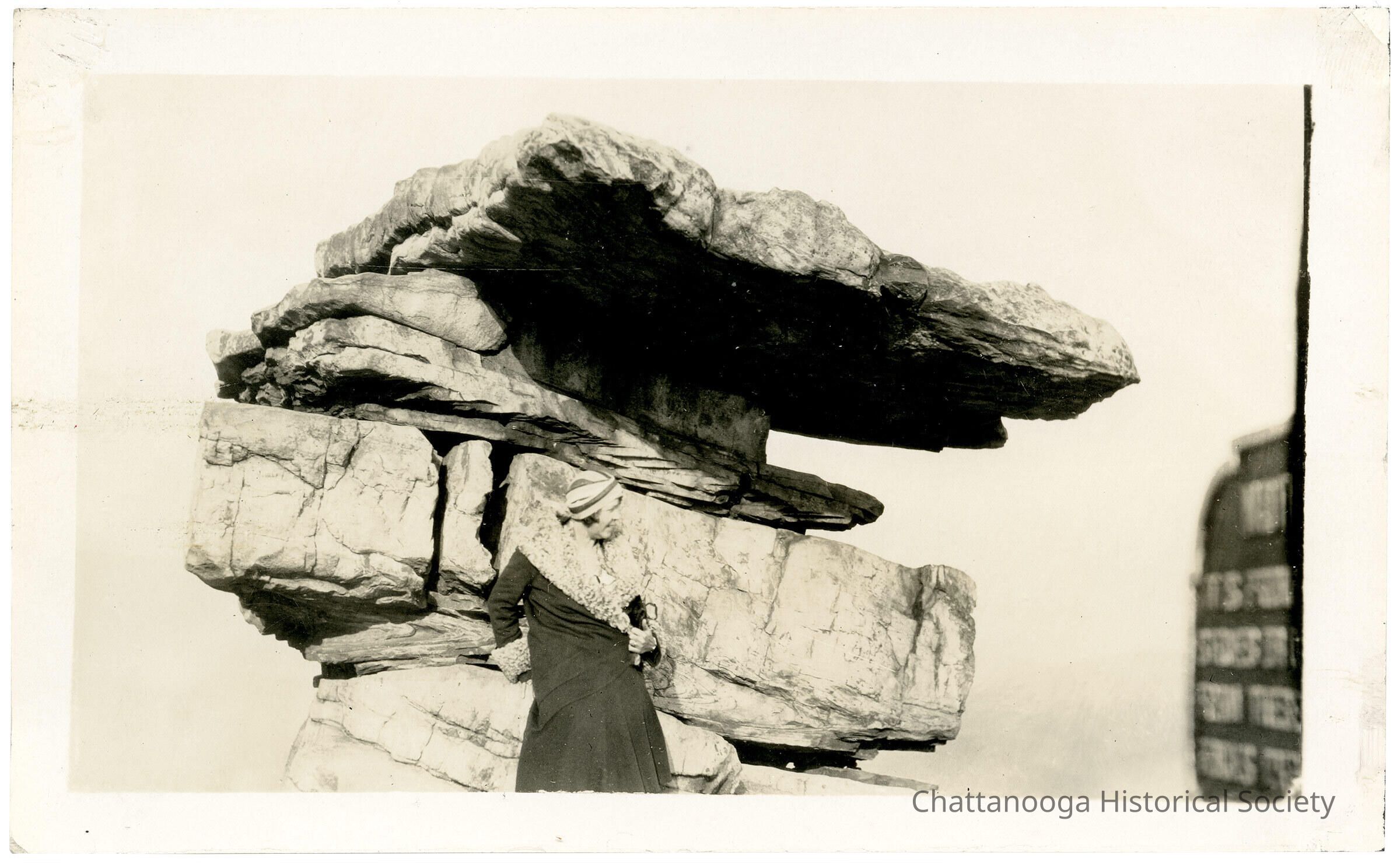 A photograph of a woman posing in front of Umbrella Rock atop Lookout Mountain, Tennessee.