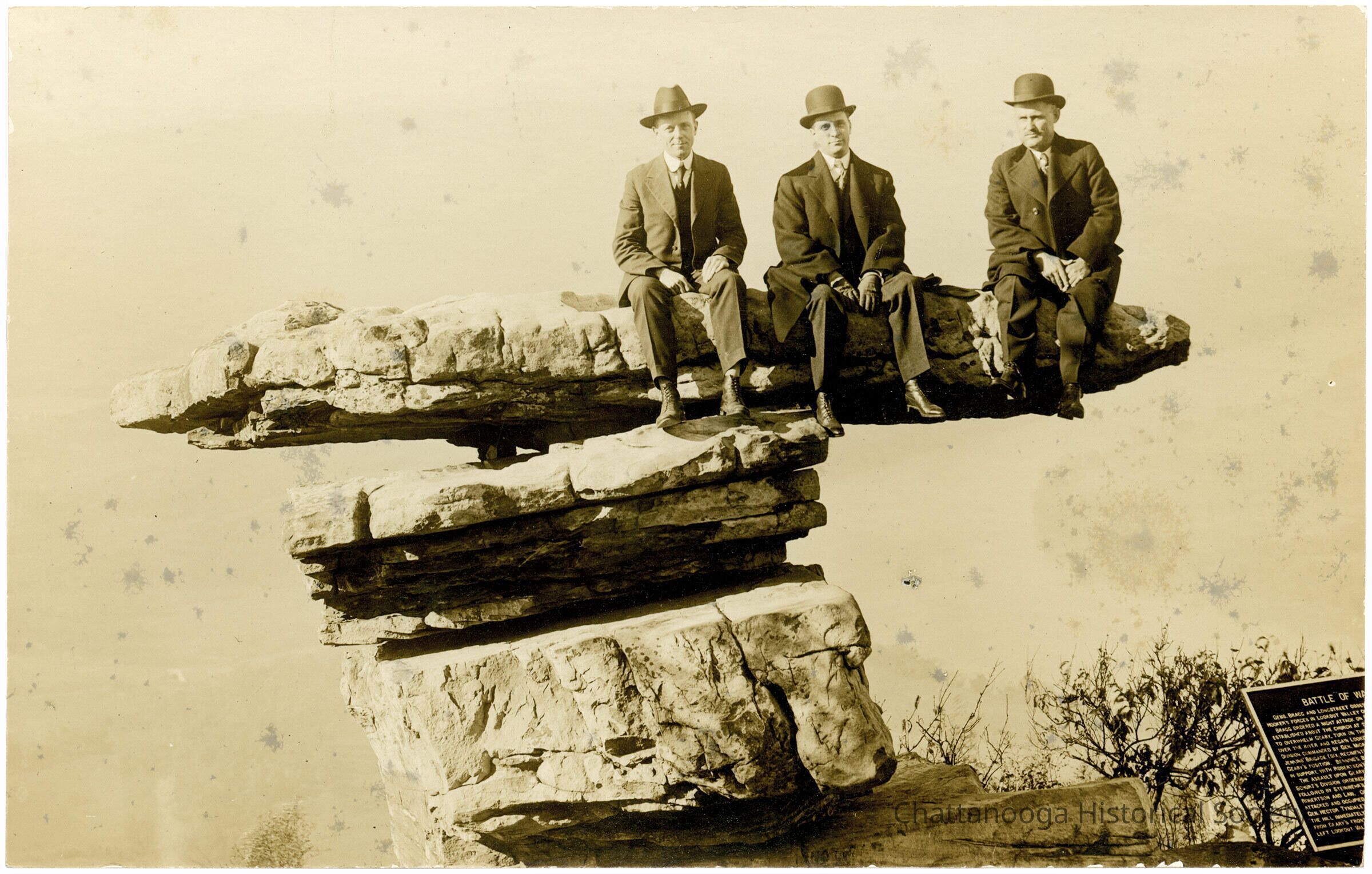 A photograph of three men posing on Umbrella Rock atop Lookout Mountain, Tennessee.