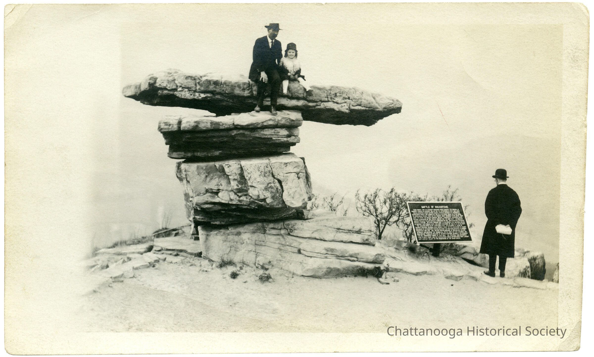 A photograph of an adult male and female child sitting on Umbrella Rock. Another man is standing right with his face away from the camera position, reading the historical marker for the Battle of Wauhatchie.