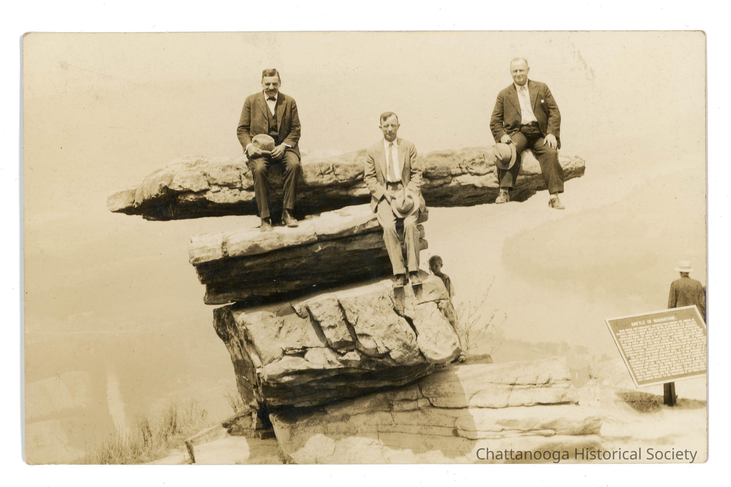 A black and white photograph of three men on Umbrella Rock developed on postcard paper. The image shows two men in suits on opposite ends of the top of the rock formation. A man in a light colored suit is sitting on the rock shelf below the top at center. A young boy can be seen hiding behind the body of the rock base. The Tennessee River and Moccasin Bend can be seen in the background as well as another sightseer in the far right, behind the Battle of Wauhatchie marker. The rear has "Aug 20/29 Lookout Mountain, Tenn" is written in pencil on the rear.Photograph Details