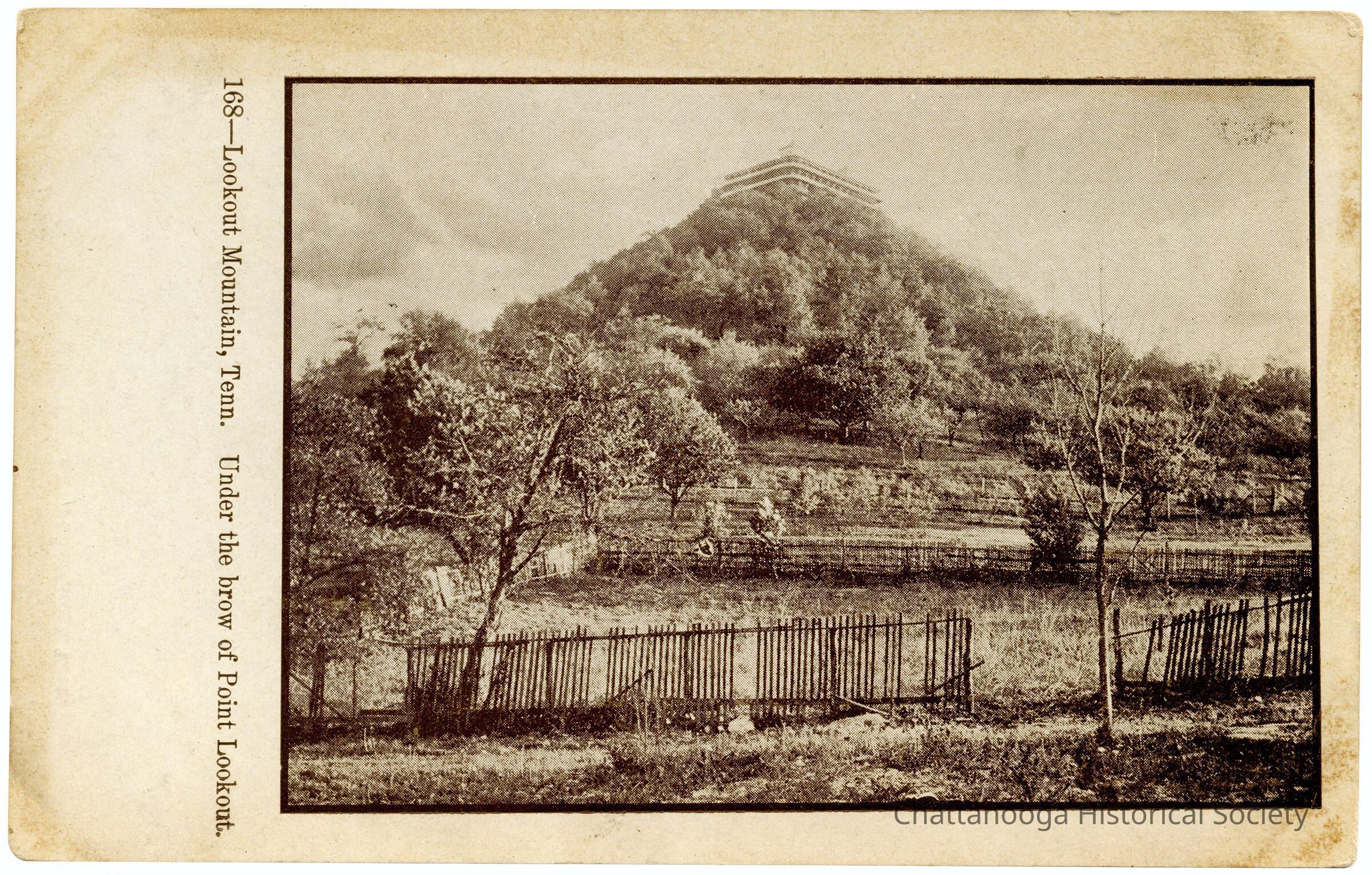 A postcard with the front showing a photograph of Lookout Mountain, Tennessee. The (Lookout) Point Hotel is seen just below the point of the Mountain.