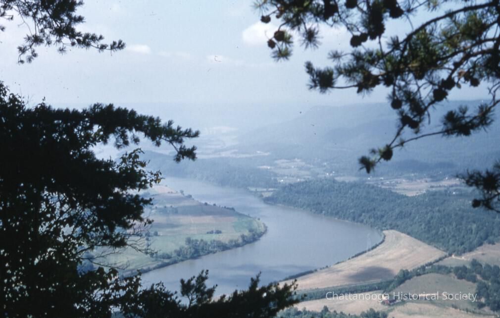 A Kodachrome Transparency slide showing the Tennessee River and Lookout Mountain from Signal Mountain, possibly Brady Point. The image is framed by evergreen limbs and the river is in the background. Chattanooga and Lookout Mountain are in the background.