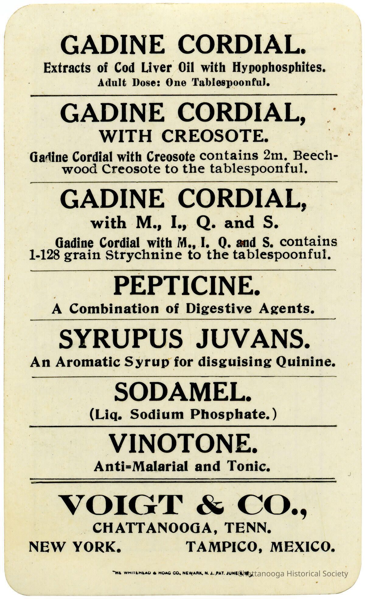 A 1909 celluloid pocket calendar with the front side promoting the patent medicine products sold by Voigt & Company.