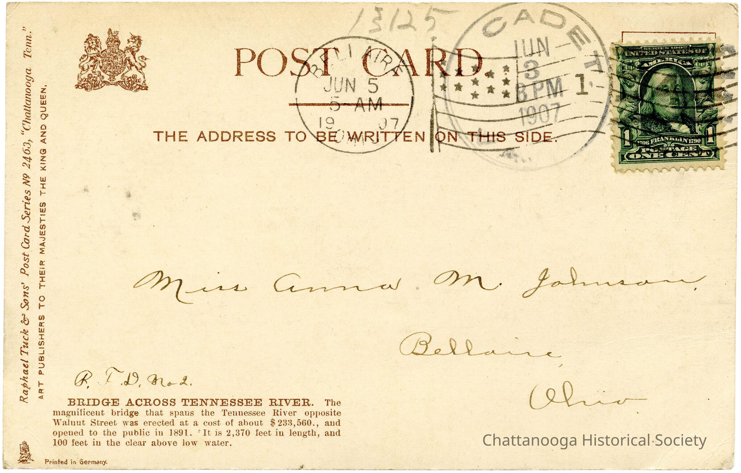 A postcard with the front showing a color-tinted photograph of Hamilton County Bridge (Walnut Street Bridge) looking from downtown Chattanooga across the Tennessee River towards Hill City (North Chattanooga).