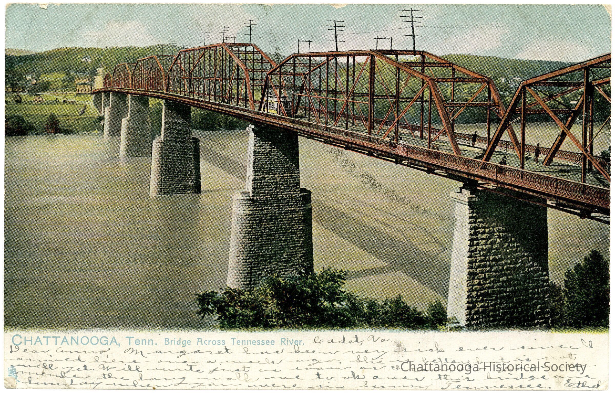 The postcard reads "CHATTANOOGA, Tenn. Bridge Across Tennessee River."