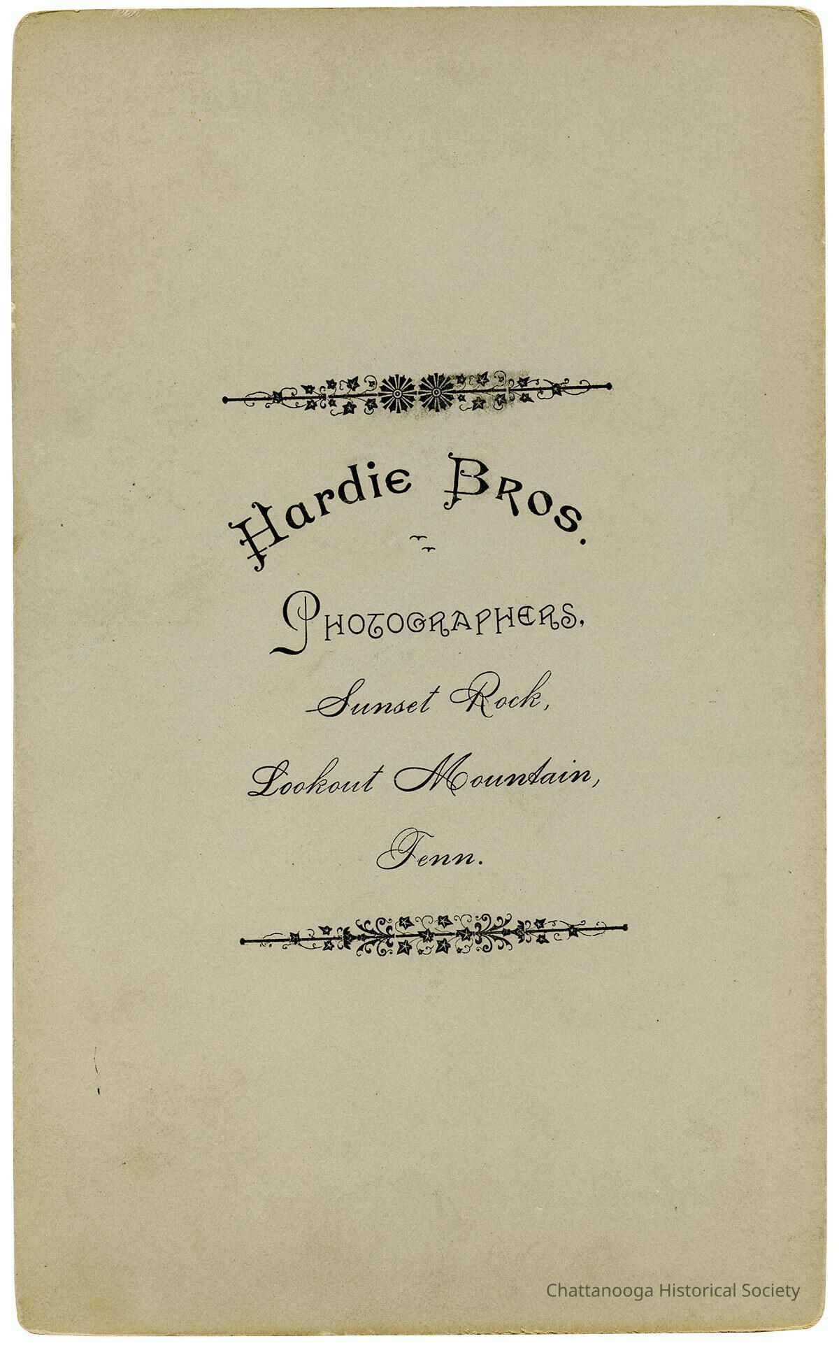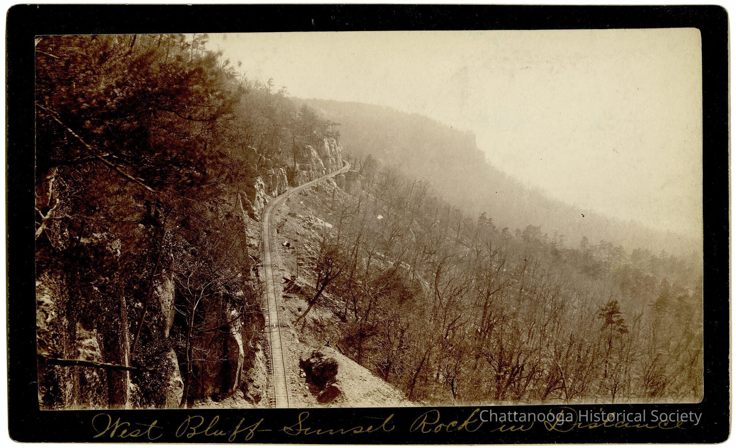 A photograph mounted on a dark green, gold edge cabinet card showing the western brow of Lookout Mountain, Tennessee, looking west along the tracks of the Narrow Gauge Railway. The track comes up from the center of the image to wind around the side of the rock formation.