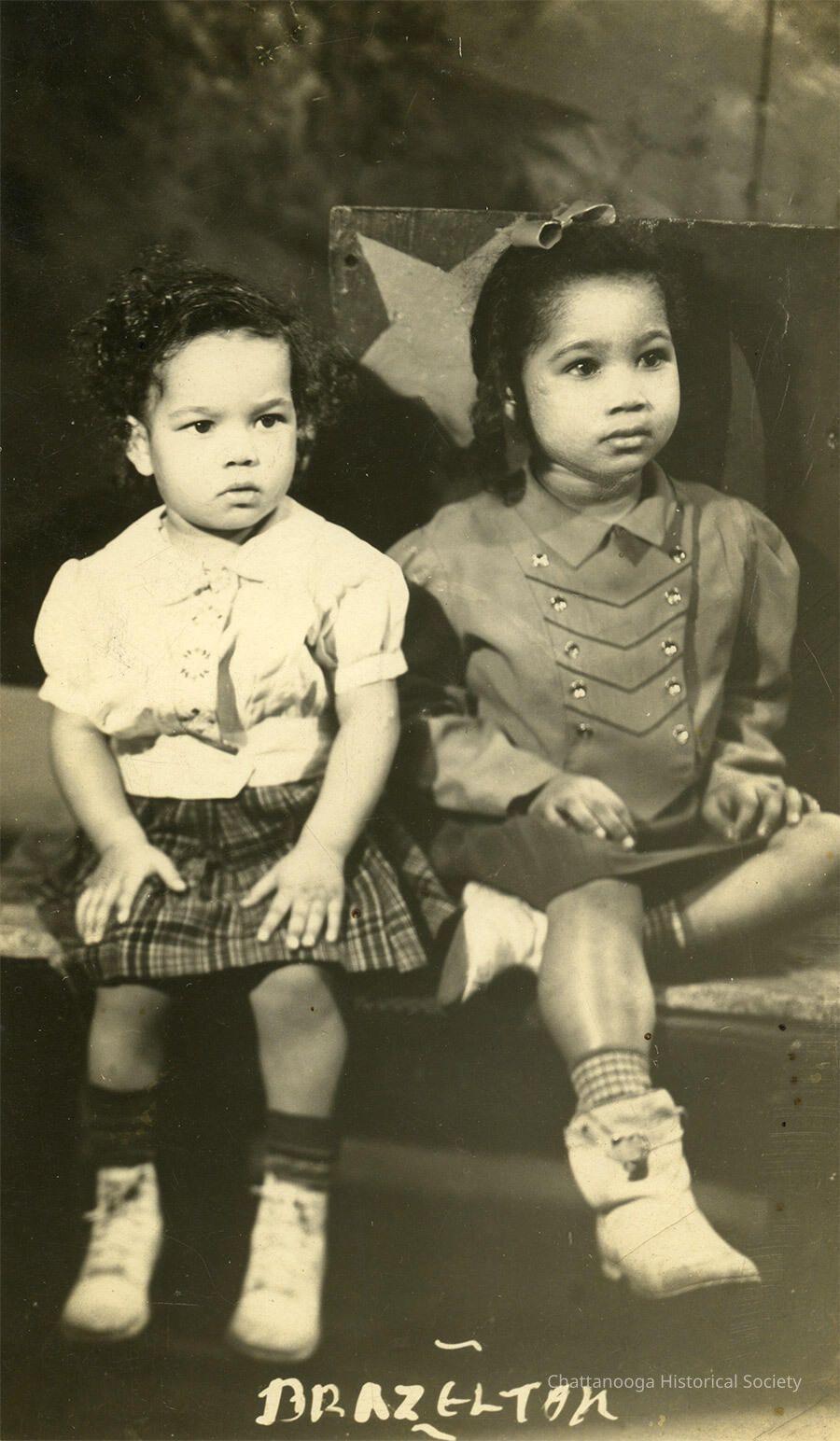 A black and white photograph developed on postcard paper of two young girls. The younger girl on the left is wearing a white button up blouse with puff sleeves and a plaid shirt. She is wearing white lace up leather ankle boots. The older girl beside her has a bow in her hair and is wearing a double-breasted majorette styled top with a dark skirt and white boots. The girls are seated on a platform with a wooden cube behind that has been painted with a star on the side facing them. The negative has been marked "Brazelton" at the bottom.