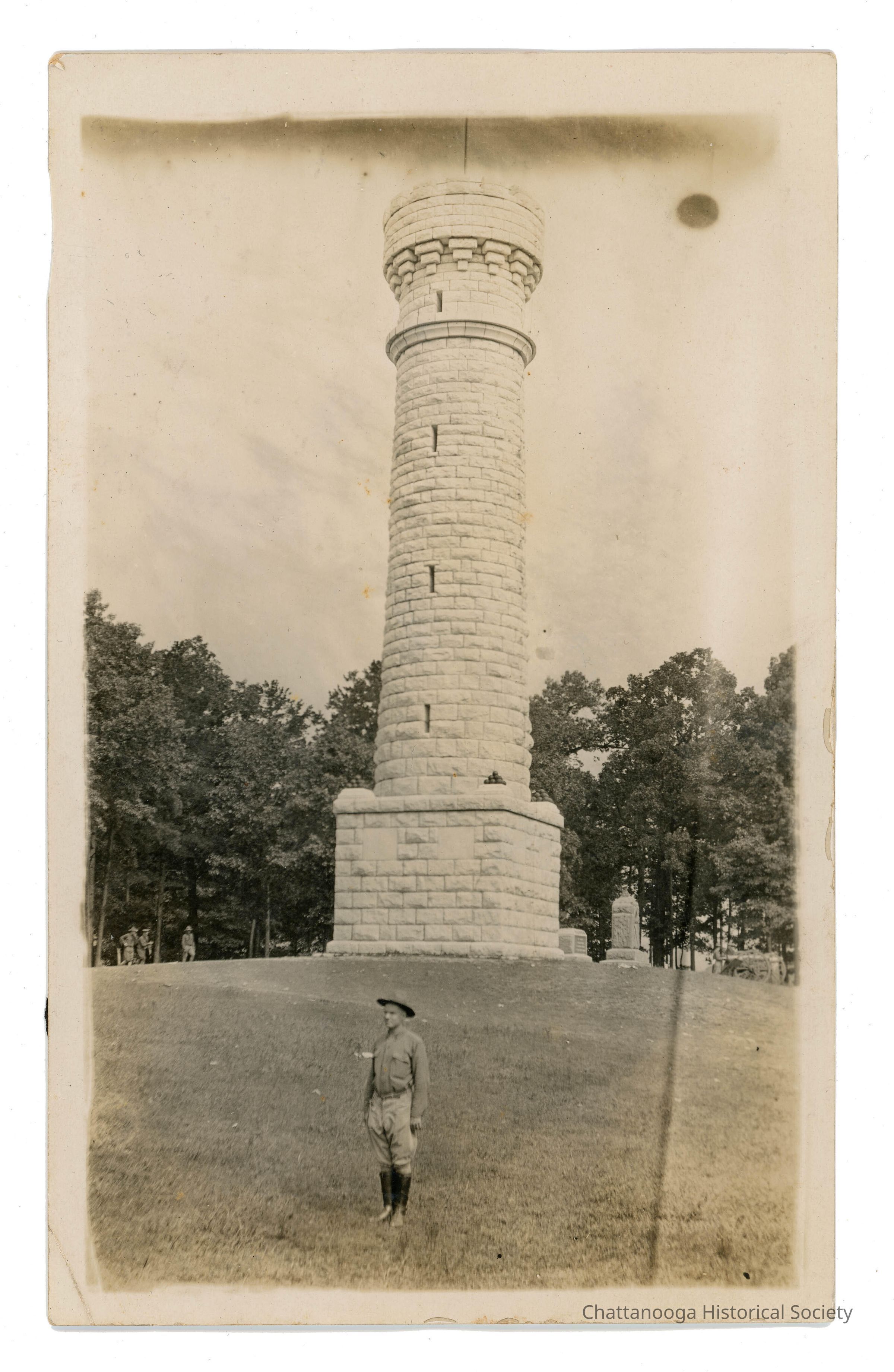 A black and white photograph developed on postcard paper of a man standing near the base of the Wilder Brigade Monument at Chickamauga Battlefied. The photograph features the 85-foot limestone watchtower at center with a uniformed soldier at bottom center wearing a WWI era uniform of knee-boots, jodhpurs, and a tan button-up shirt. Other soldiers can be seen in the photograph's midground to the left.Photograph Details