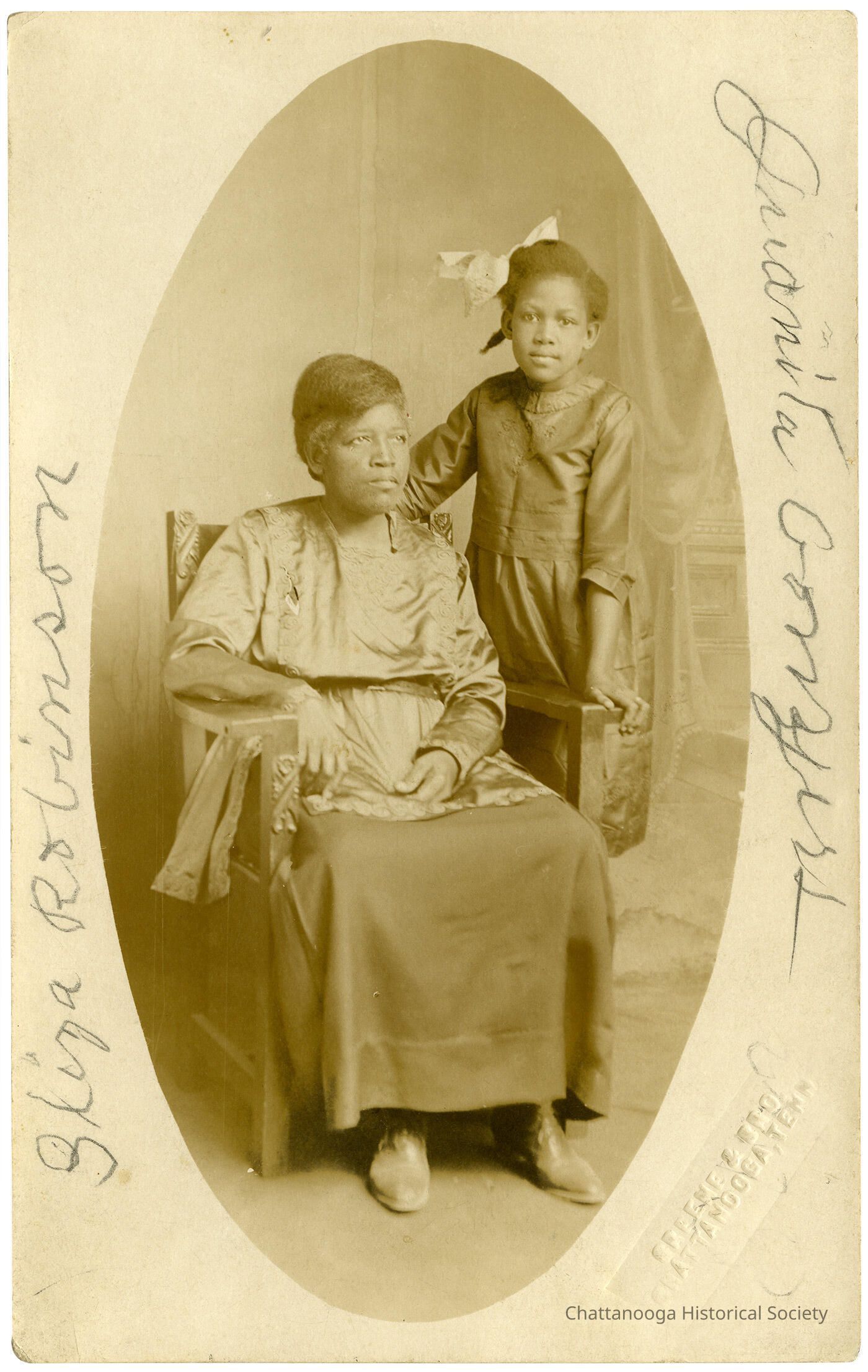 A real picture postcard with the front showing of two females, one sitting and one standing beside her. The woman sitting in the chair is wearing a satin tunic, while a young girl with a bow in her hair stands to her left. Their names, "Eliza Robinson" and "Juanita Conyers," are written vertically in the left and right margins.