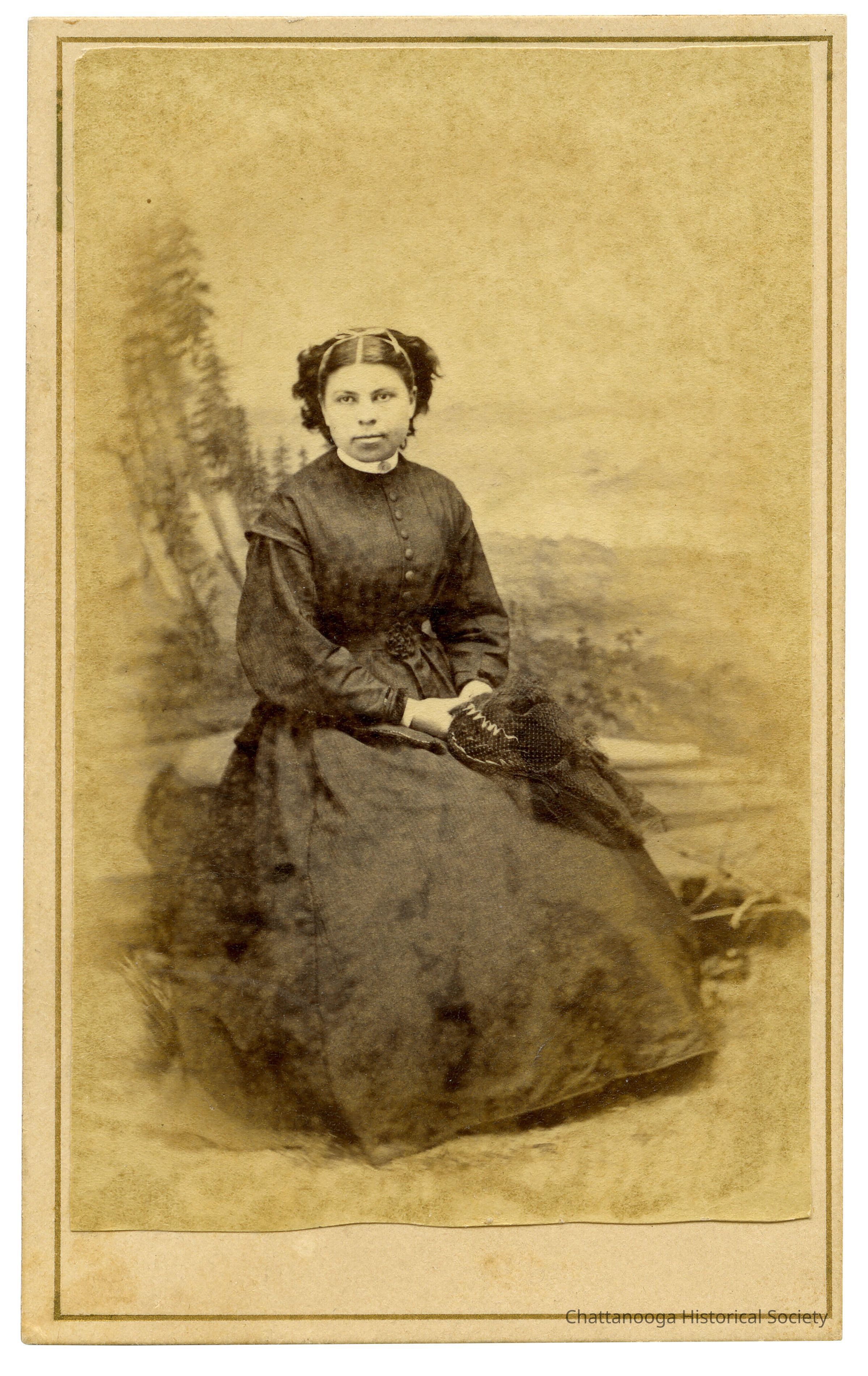 Black and white CDV photograph of a woman in a black dress sitting for her portrait. The woman is wearing a black dress with a button up bodice and white collar. The armscye is sitting below her shoulder and her jacket-styled sleeves are closed at the wrist with white cuffs peeking out. Her hair is parted down the middle and tied with a light ribbon. She is holding a hat with black and white accent ribbons and netting in her clasped hands. She is posed in front of a painted studio backdrop to look as if she is sitting in front of a forested mountain. The rear of the carte de visite reads "Mountain City Gallery, Chattanooga, TEnn. R.M. Lynn & Bro., Photographers."Photograph Details