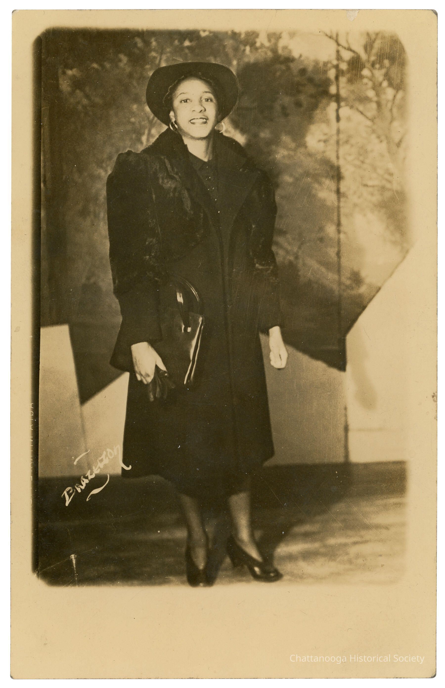A black and white studio photograph developed on postcard paper of a woman wearing a dark fur coat and hat. The woman is standing in front of a studio backdrop and holding a dark handbag and gloves in one hand. The negative has been marked "Brazelton" on the left.Photograph Details