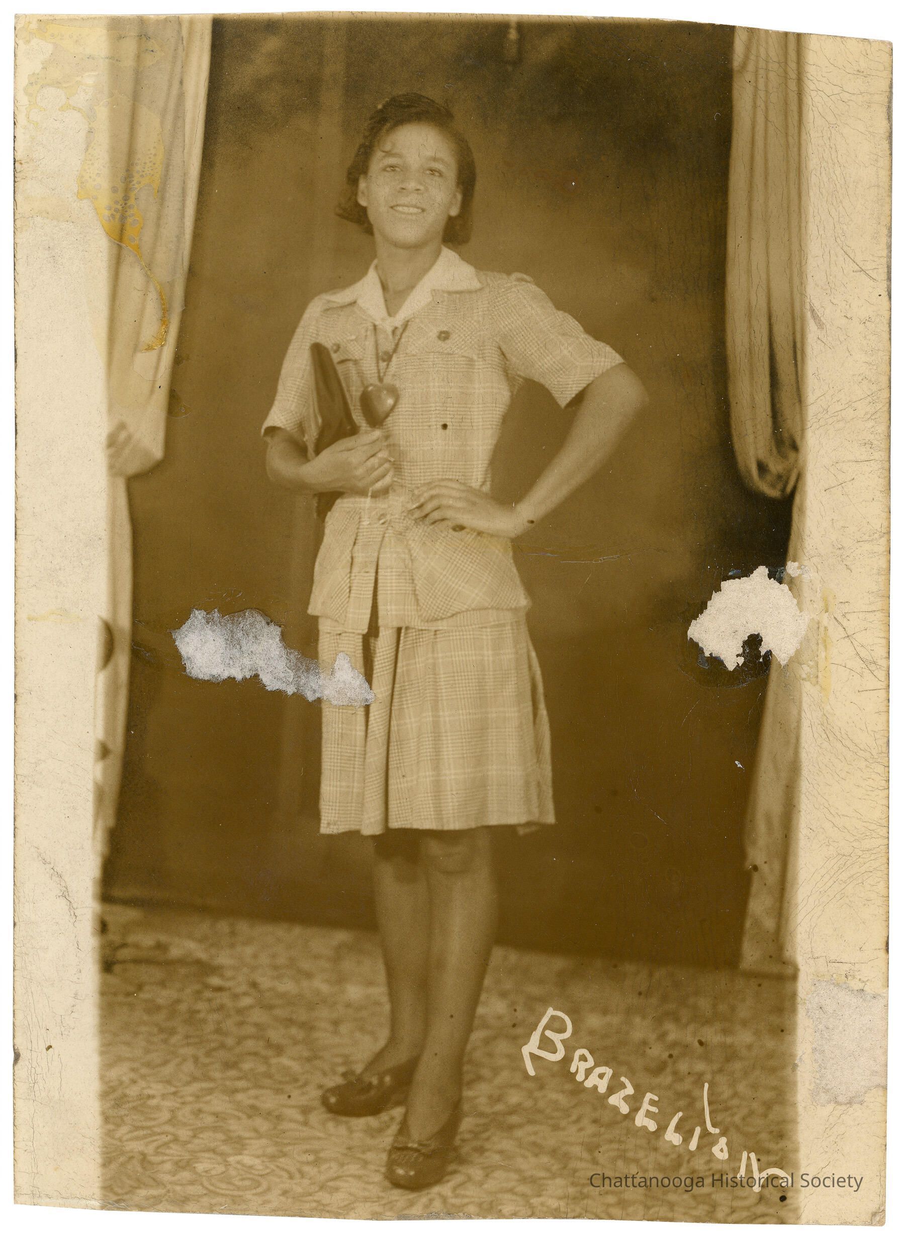 Black and white studio photograph developed on postcard paper of a young woman wearing a plaid jacket and skirt. She is posed with one hand on her hip while holding a handbag in the other. The woman is also wearing a large heart shaped pendant. She is posed standing in front of a plain dark backdrop with curtains on either side. The negative has been signed "Brazelton" at the bottom right and someone has written "1946" on the rear in pencil.Photograph Details