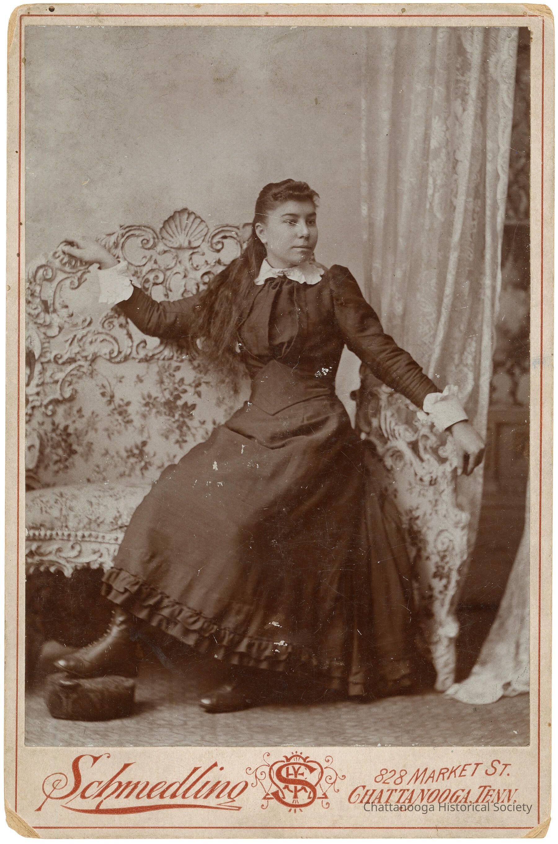 Black and white photograph mounted on a cabinet card of a young woman in black in a studio setting. She is seated on an ornate rococo love seat. She is dressed in a black dress with puffed shoulders and a white collar and cuffs. Her hair is in a half-up, half down style with the longer length over her shoulder. The is wearing leather button-up ankle boots with one resting on a stone sitting on the floor. She is sitting in front of a blank backdrop with curtains to her left. The photograph is imprinted "Scmedling 828 Market St., Chattanooga, Tenn." in the gutter of the cabinet card. "1893" and "Annie Keef - Johnson [Minnick?]" is written in ink on the rear.Photograph Details