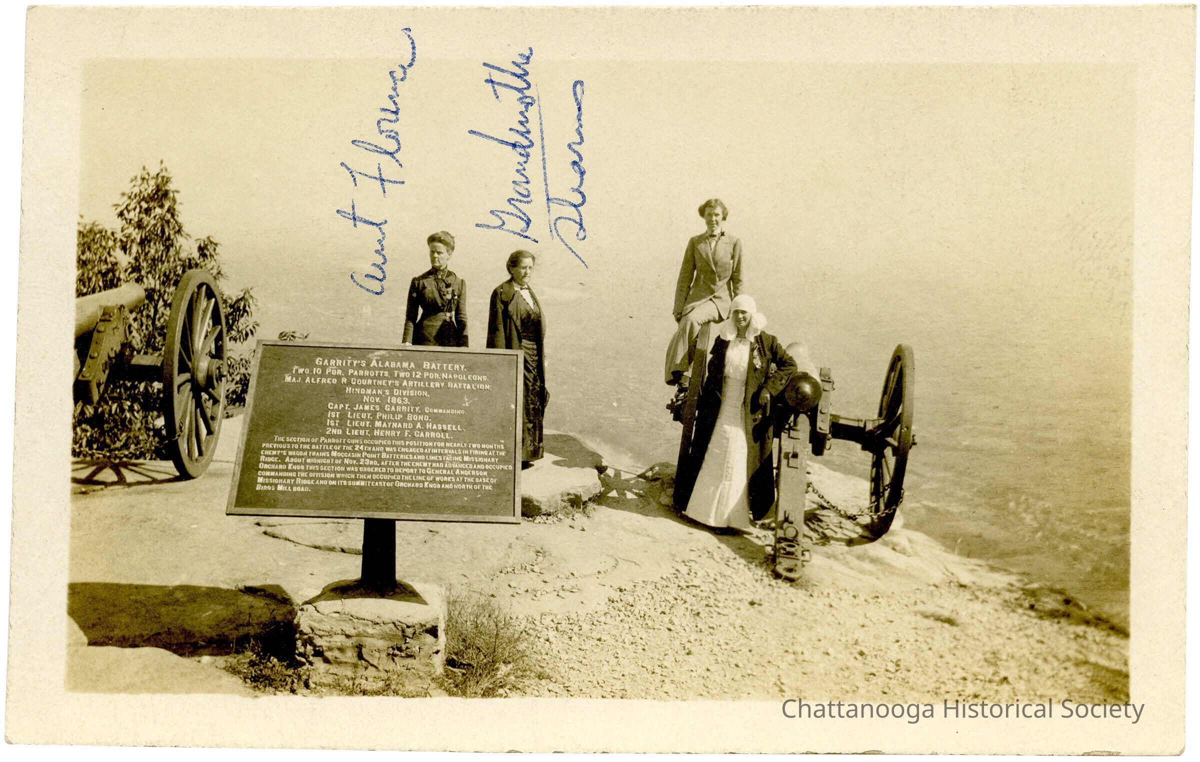 A group of four women the site of Garrity's Alabama Battery in Point Park on Lookout Mountain, Tennessee. Two of the women, at center, are tagged as being Aunt Florence and Grandmother Stearns. There are two other women to the right posed on artillery. The woman in the front is wearing a white dress and dark jacket as well as a white headpiece. There is also a woman in a woolen suit sitting on the cannon's wheel. The historic marker for the memorial is in the foreground at center.Photograph Details