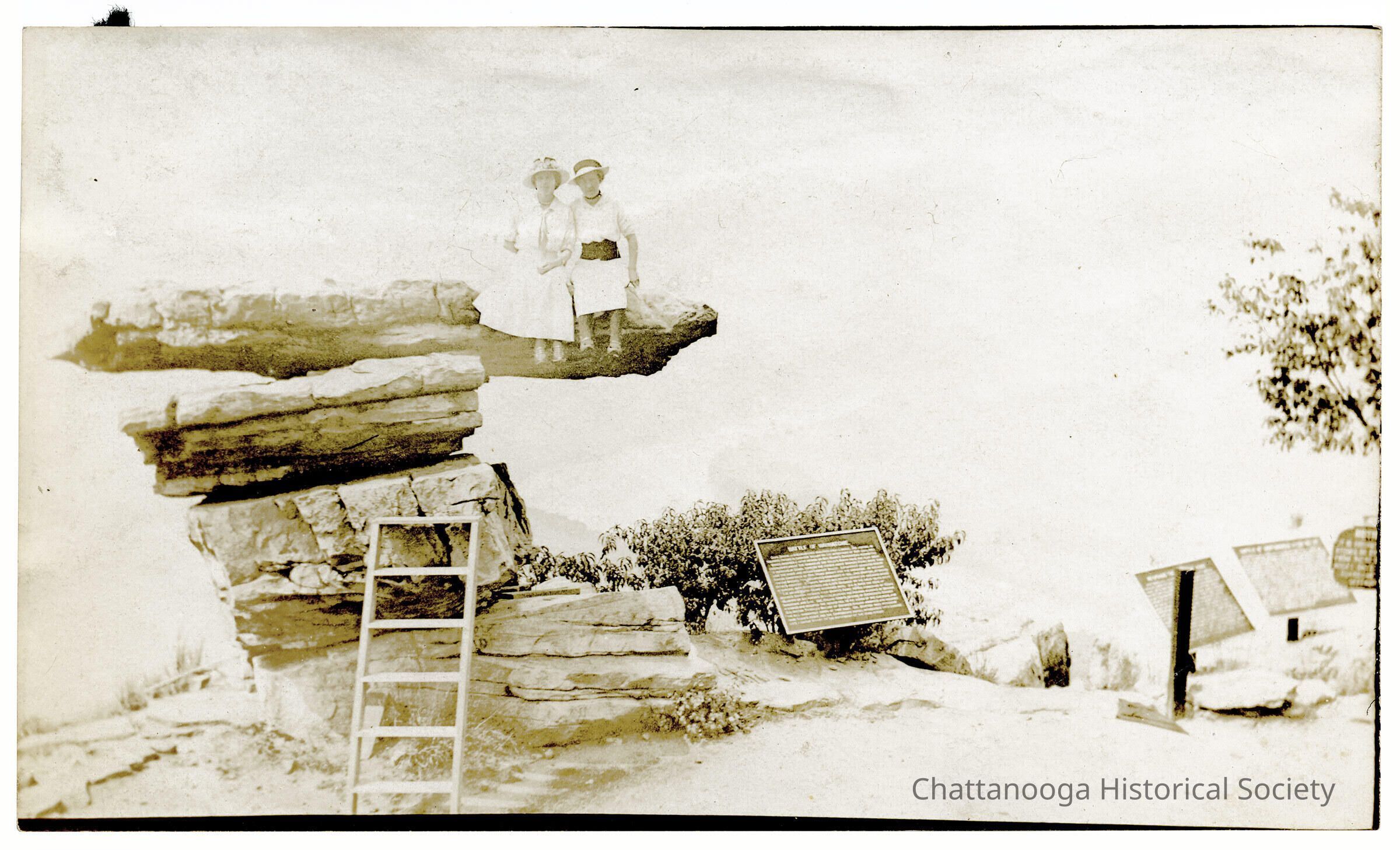 A photograph showing two women sitting on Umbrella Rock atop Lookout Mountain, Tennessee. Both women are wearing white dresses but the one on the right is wearing a dark belt. There is a wooden ladder at the base of the rock and the historic markers are seen at the bottom right of the photograph.