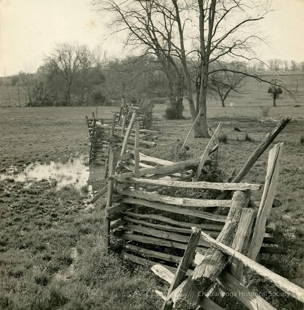 Black and white photograph of a split rail fence. The fence, built using natural split logs in a zig-zag pattern is centered in the photograph while a hilly field and trees are in the background. A puddle of water is at the base, left of the fence. This photograph is possibly a view somewhere in Chickamauga Park circa 1950. The back is stamped in faded black ink "Photograph by Richard K. Wood, Oweda Terrace, N. Chattanooga, Tenn."Photograph Details