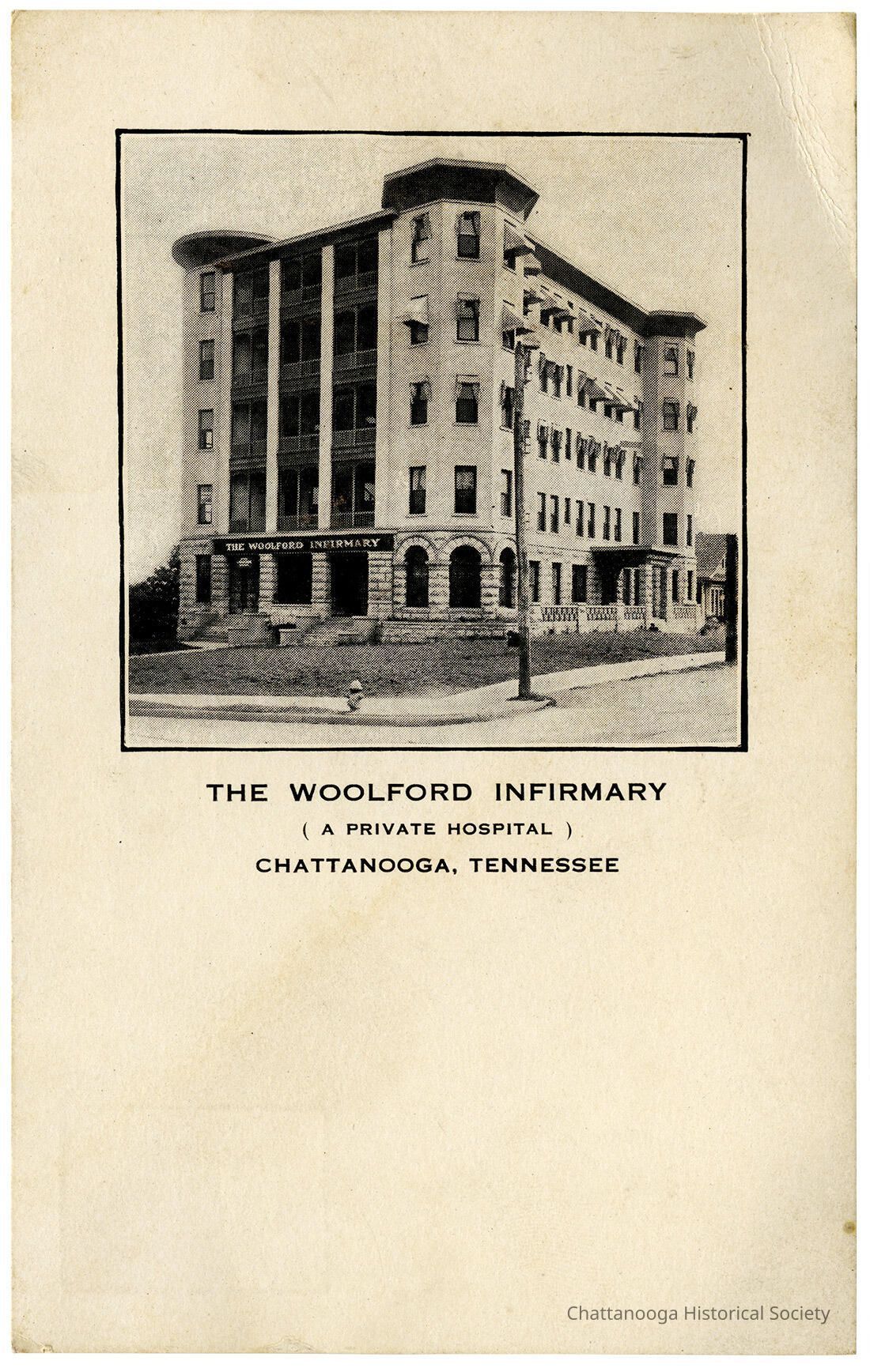 A postcard with the front showing the Woolford Infirmary, a private hospital in Chattanooga, Tennessee.