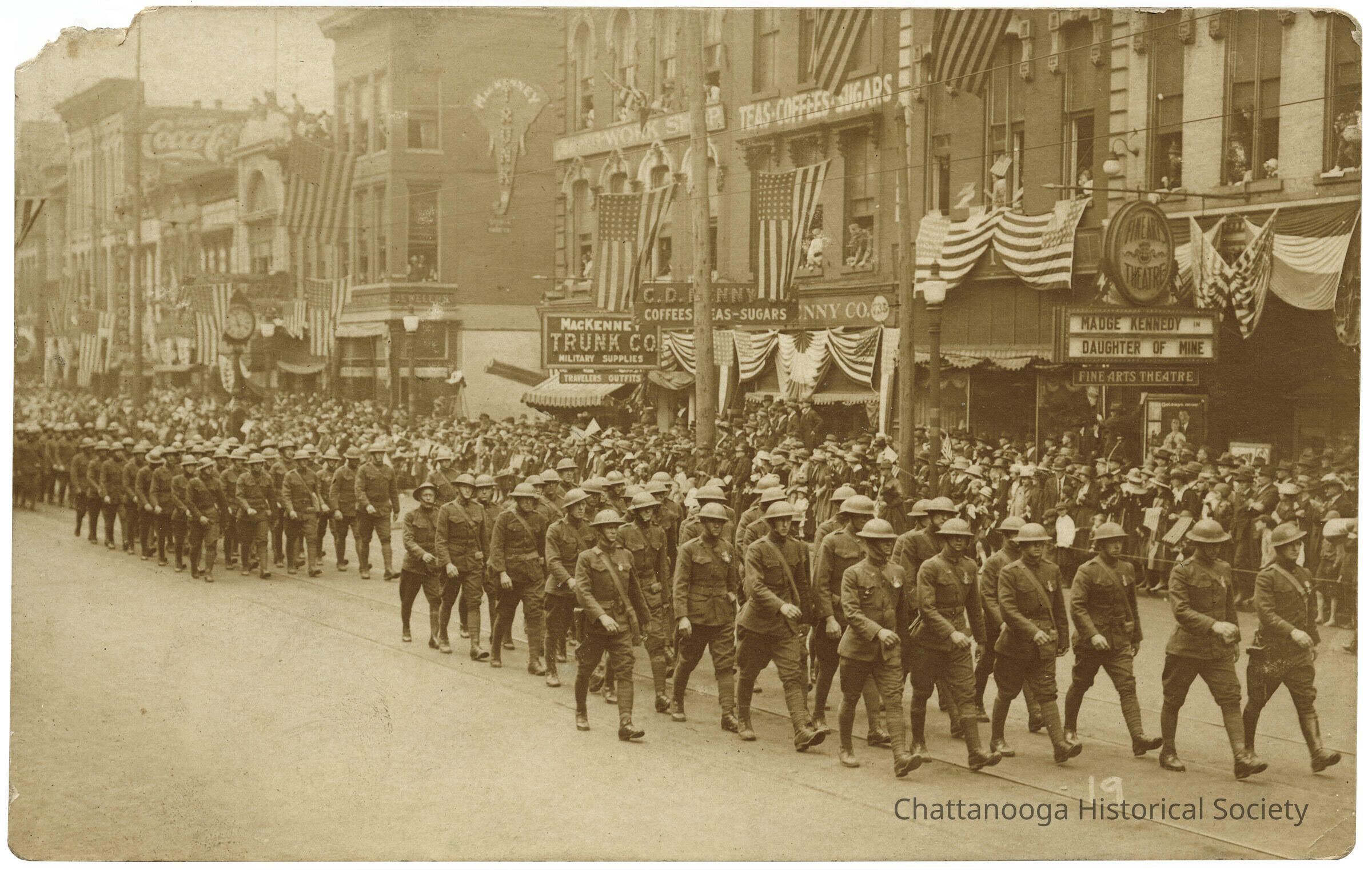 World War I era military parade down Market Street in Chattanooga celebrating the troops return to Tennessee. Stores in the background are McaKenney Trunk Co Military Supplies, Coca-Cola, and Fine Arts Theater. The theater marquee advertises for the Madge Kennedy film "Daughter of Mine"