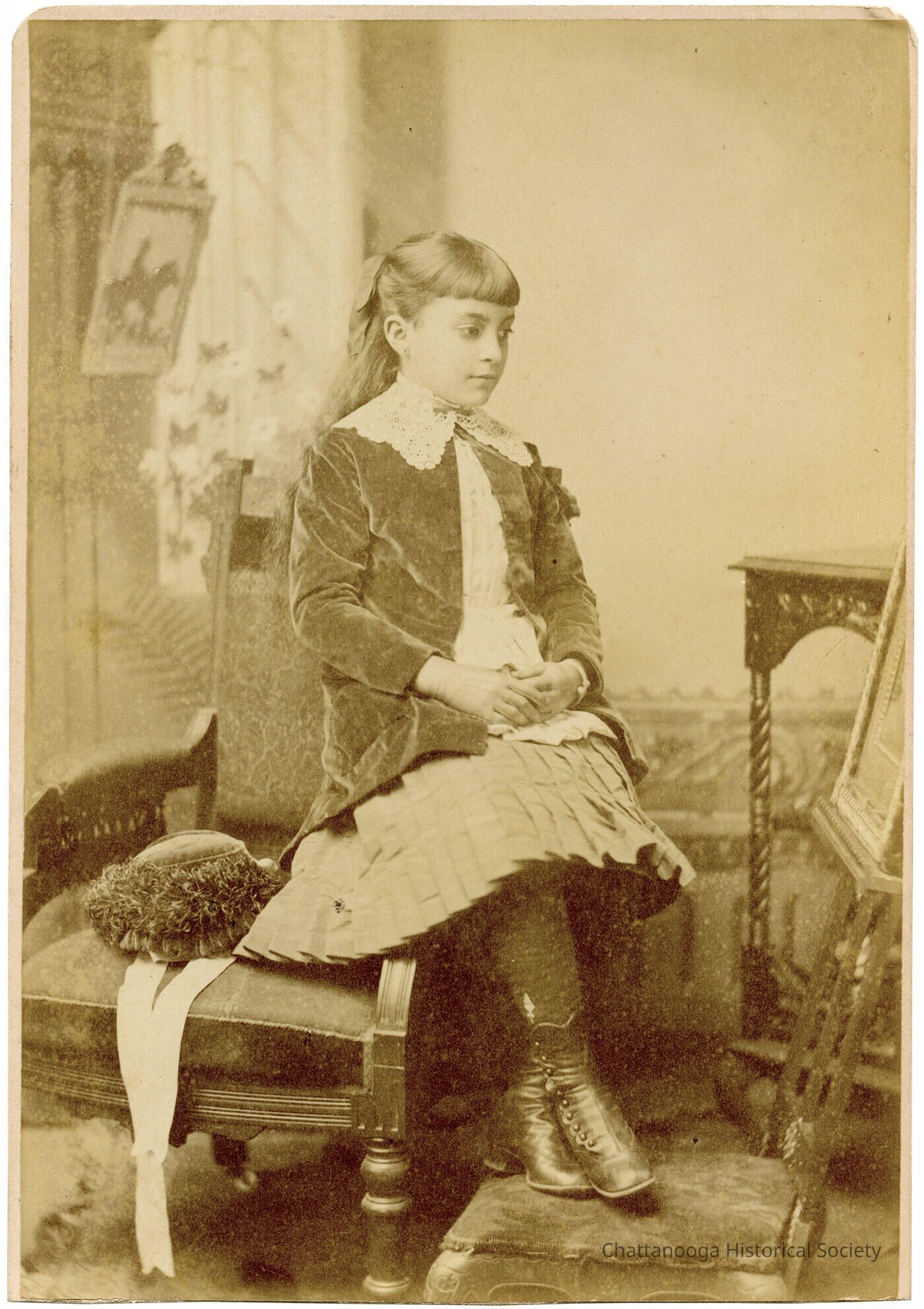 A photograph mounted on a cabinet card showing a young girl, by A. W. Judd Studio. The girl is seated on the arm of an Eastlake wooden armchair with her flowered bonnet placed on the seat. Her feat are resting on a stool and an easel with a painting sits beside her. She is wearing a pleated knee-length skirt and a velvet coat with a lace collar.