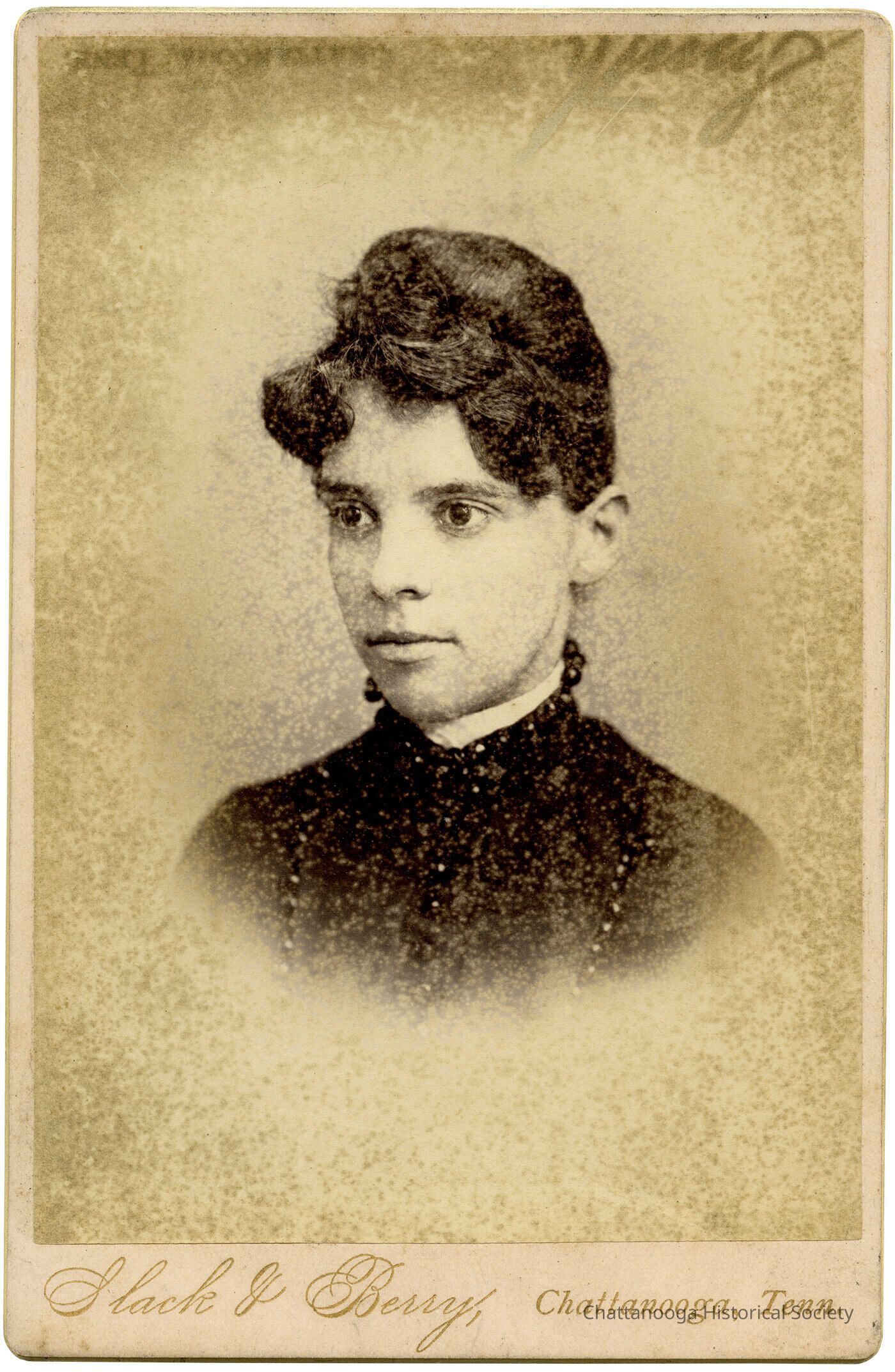 A photograph mounted on a cabinet card showing a young woman, by Slack and Berry. The woman is wearing a black dress with jet bead decoration. The photograph is gold edged and "Slack & Berry Chattanooga, Tenn".