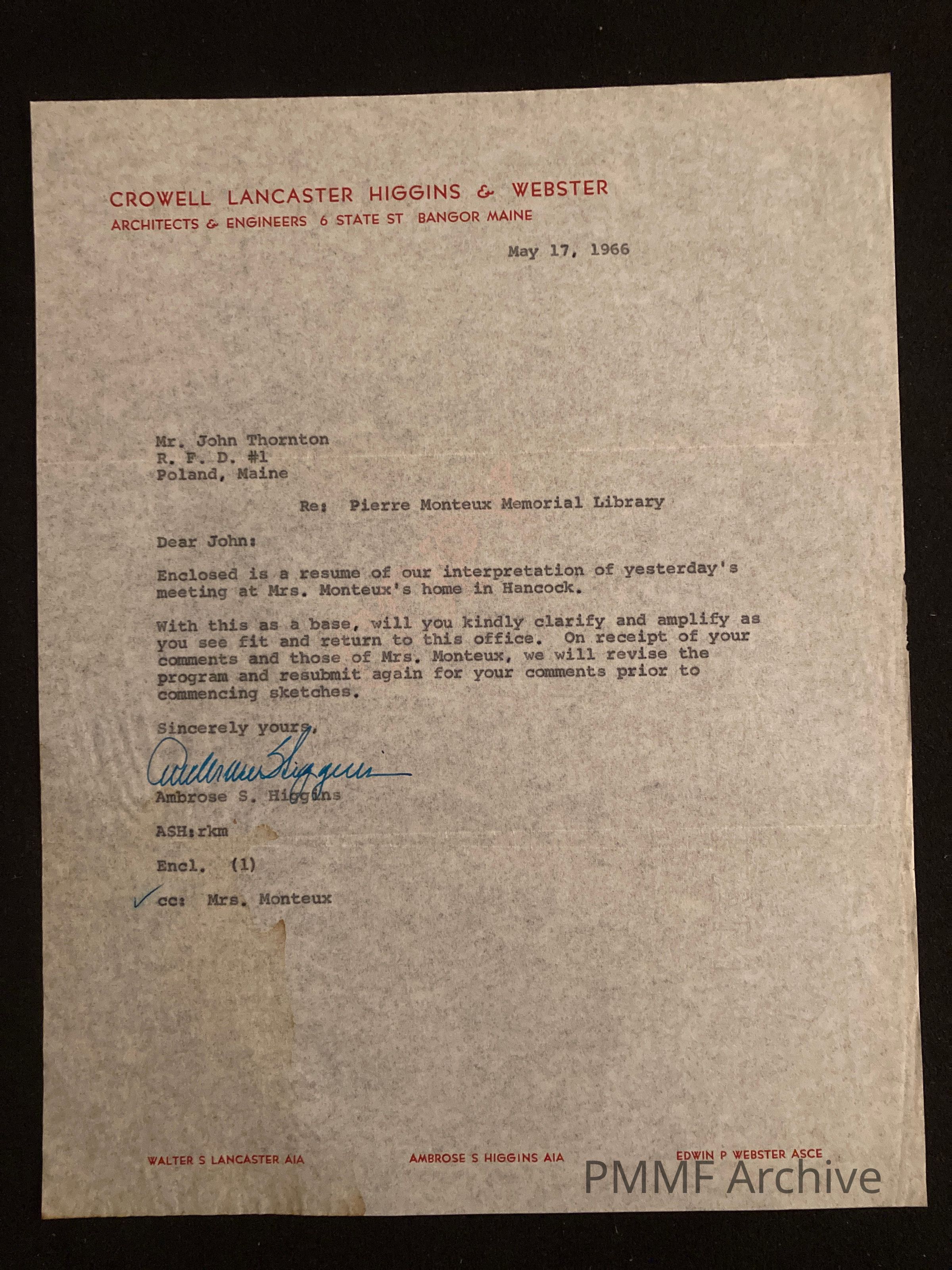 1966 Letter from Architects re: Pierre Monteux Memorial Library