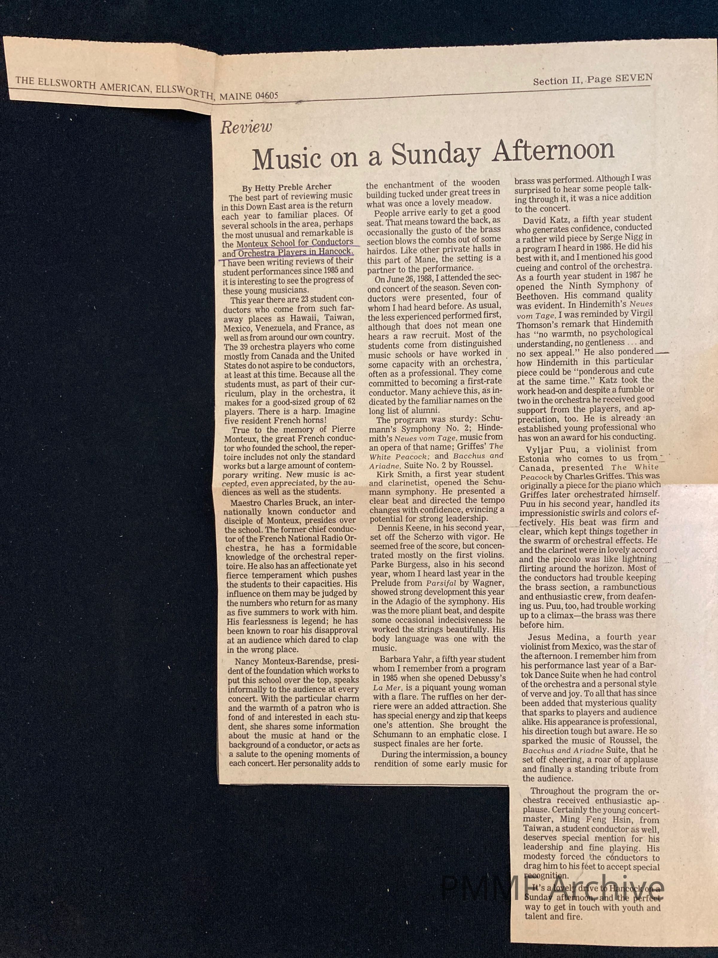 Review of June 28, 1988 concert by Betty Treble Archer for Ellsworth AmericanDescription