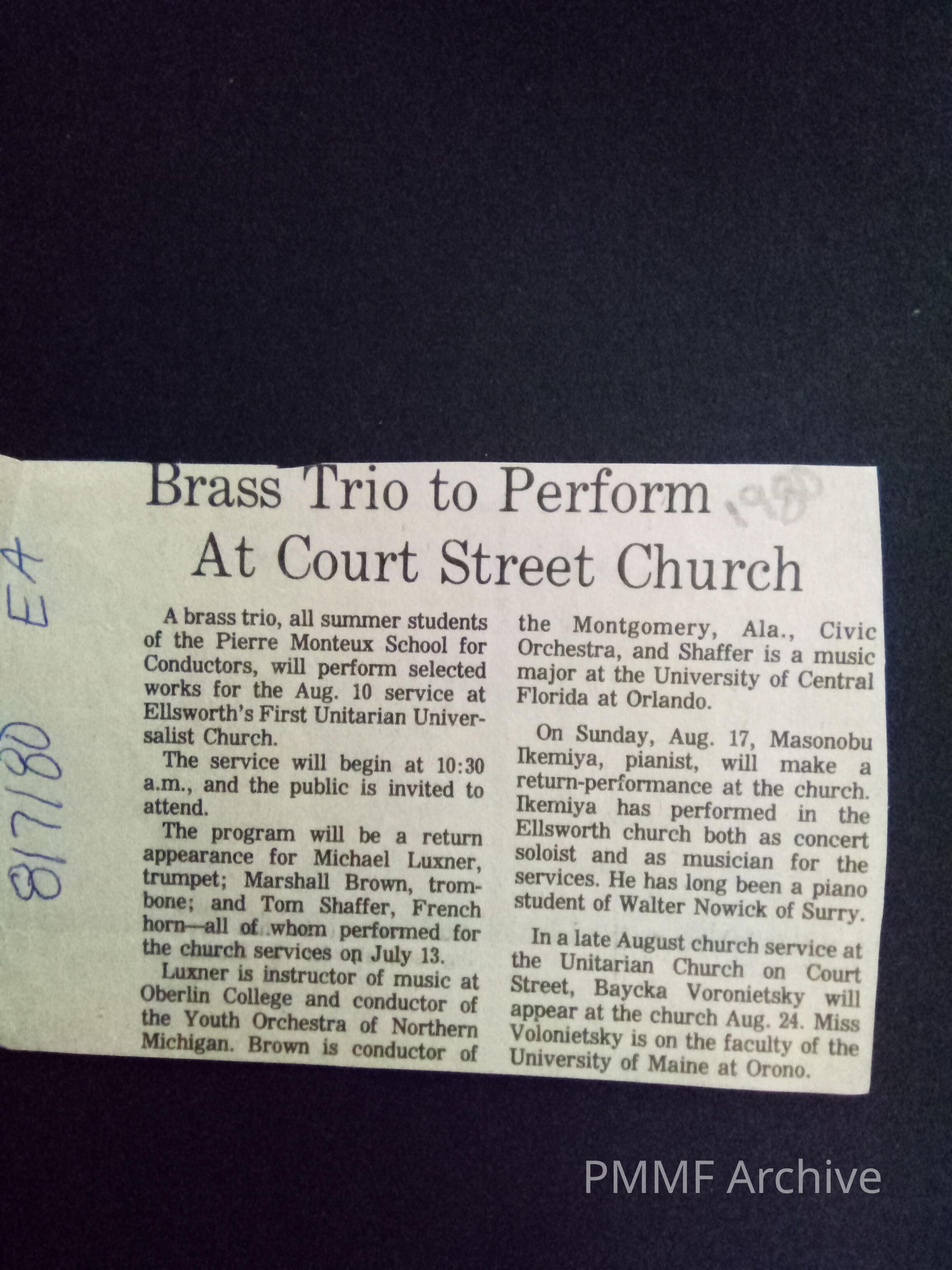 Brass trio (Michael Luxner, Marshall Brown, & Tom Shaffer) [Ellsworth American 8/7/80]