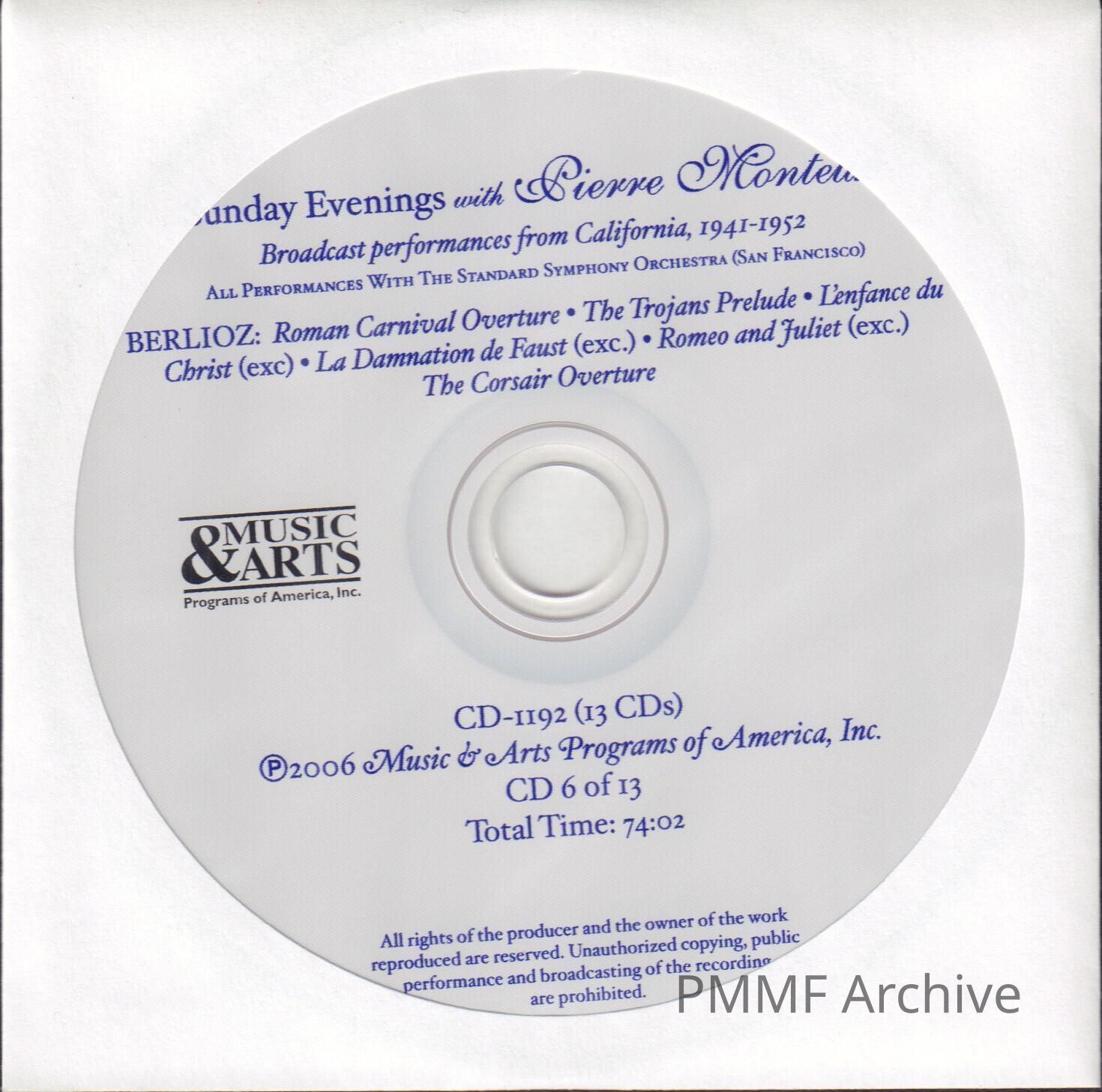 CD 6 OF 13 "SUNDAY EVENINGS WITH PIERRE MONTEUX: BROADCAST PERFORMANCES, 1941-1952" WITH THE STANDARD SYMPHONY ORCHESTRA, SAN FRANCISCO. BERLIOZEntry/Object ID