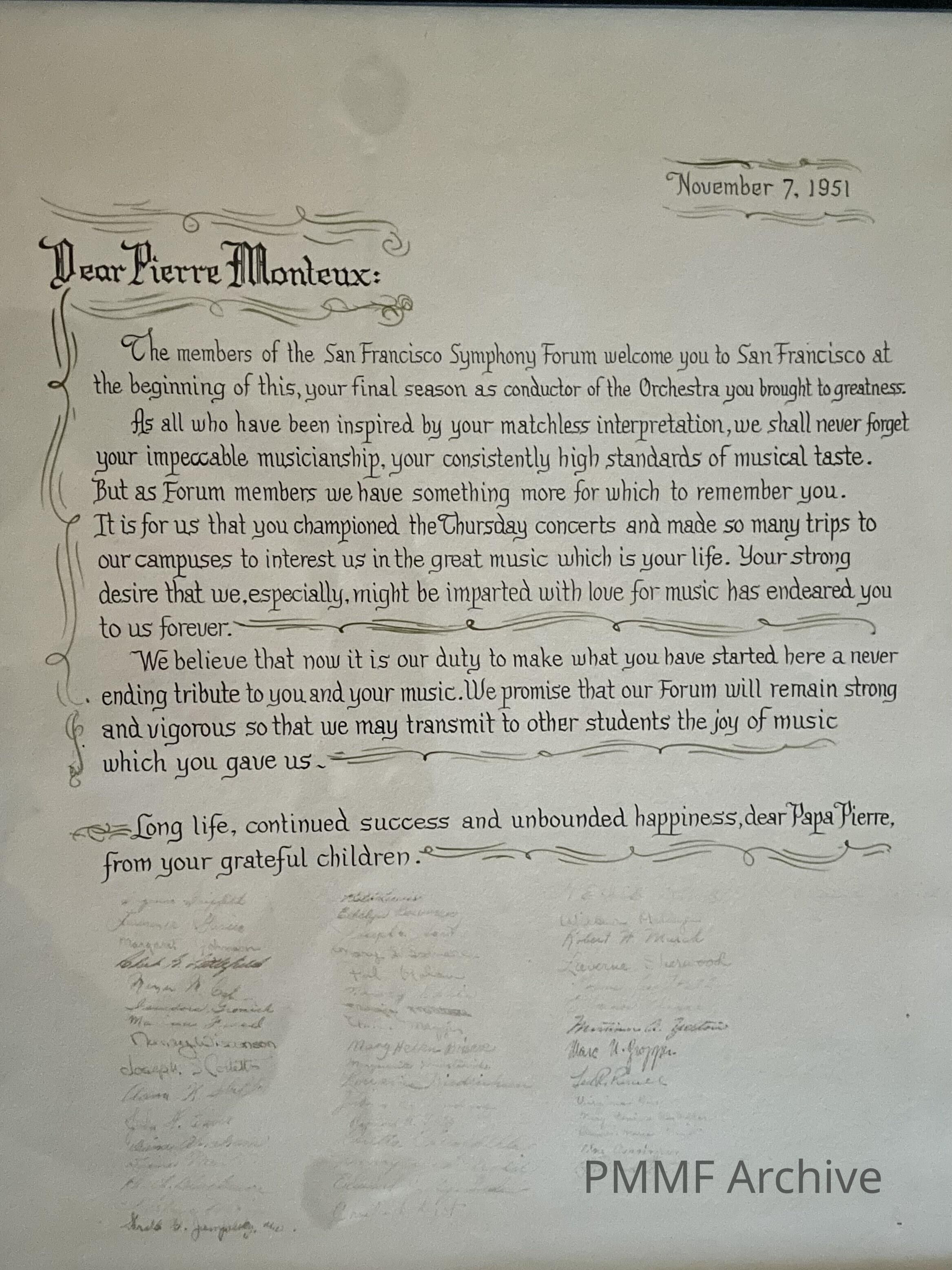 Framed Certificate of Appreciation to "Dear Pierre Monteux, upon beginning his final season as conductor of the Orchestra you brought to greatness"