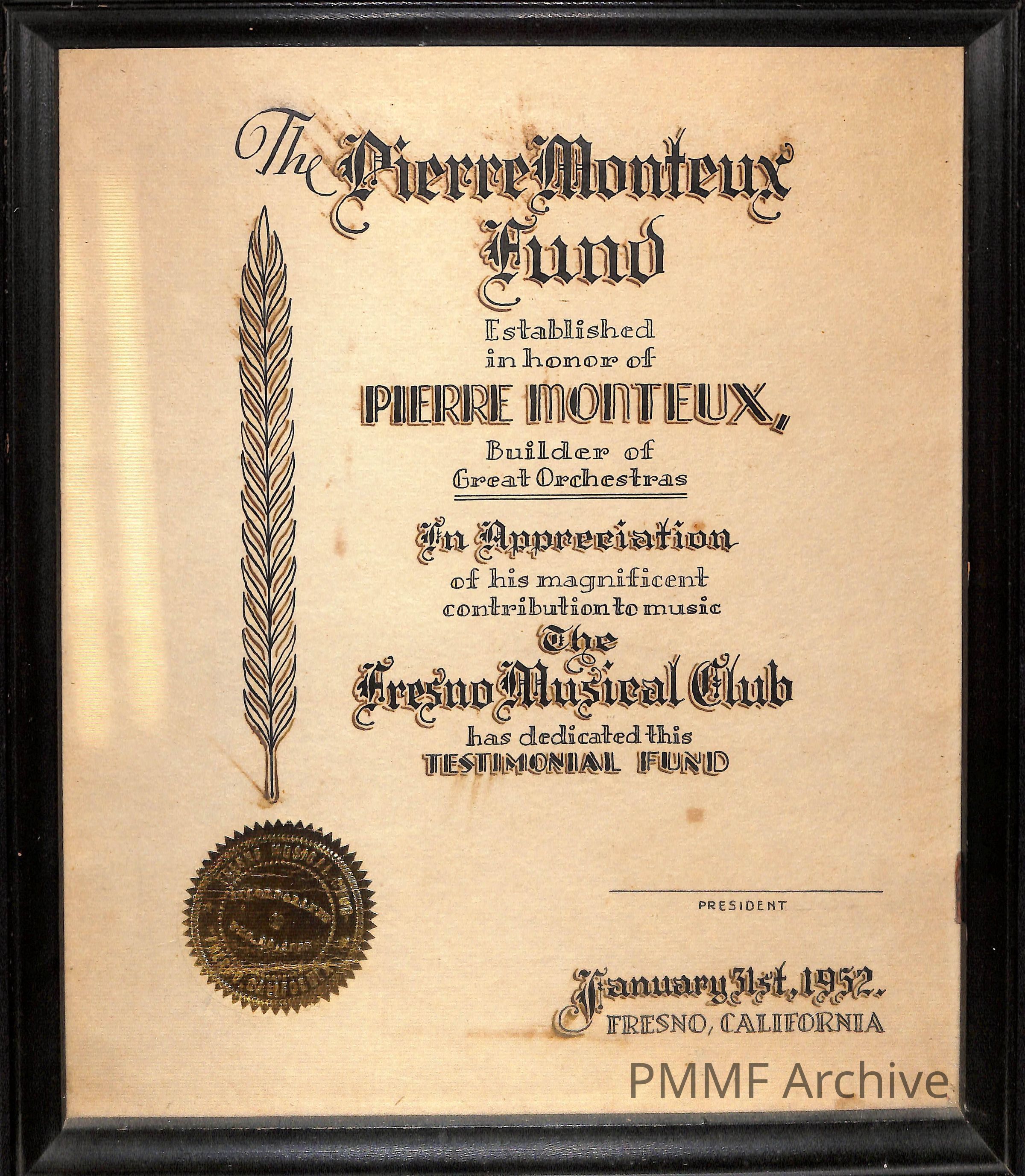 Pierre Monteux Testimonial Fund Certificate from The Fresno Musical Fund. Dated January 31, 1952. Framed 11-3/4 x 9-1/2 inches.Collection